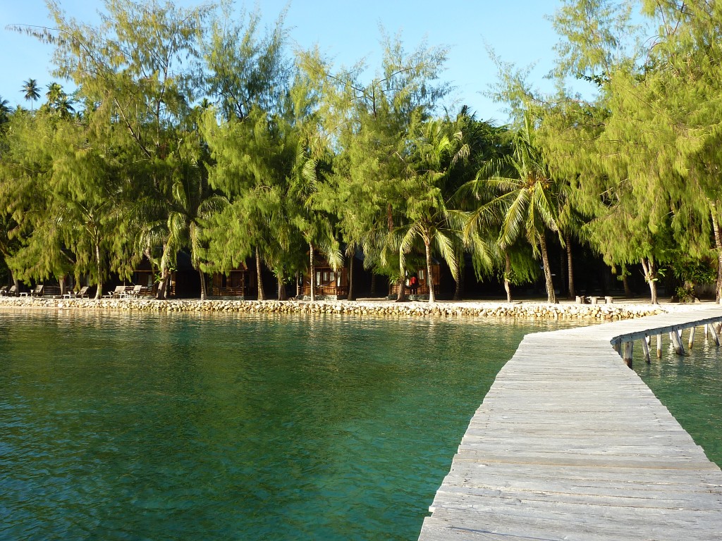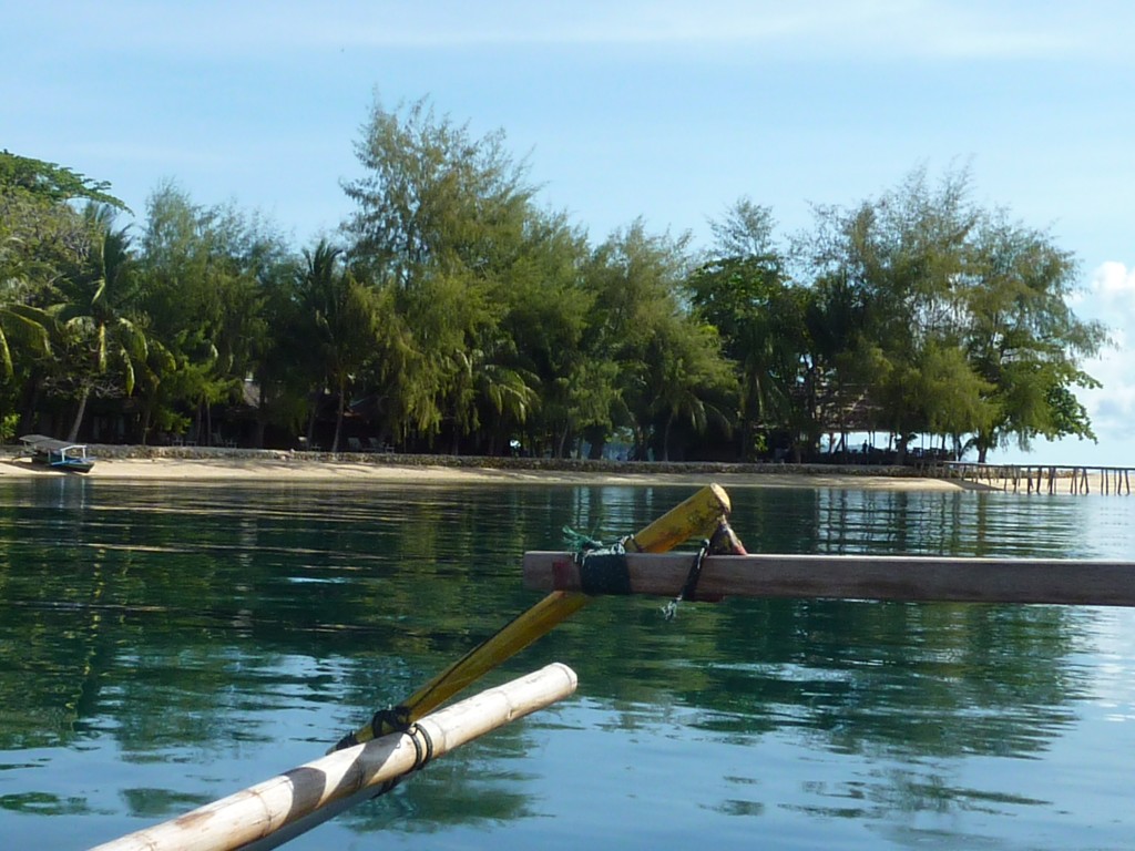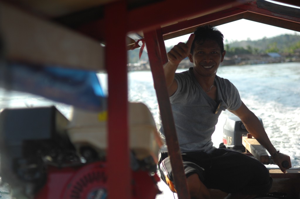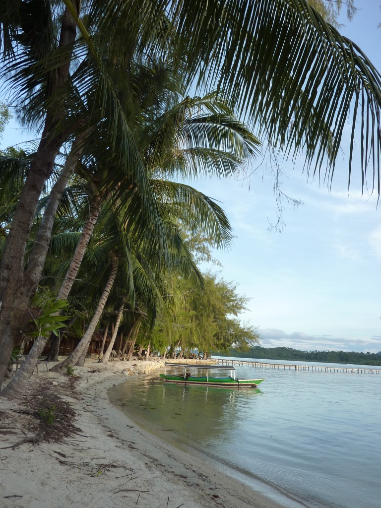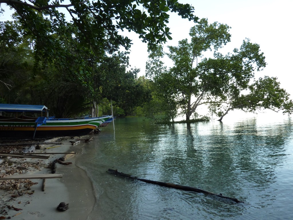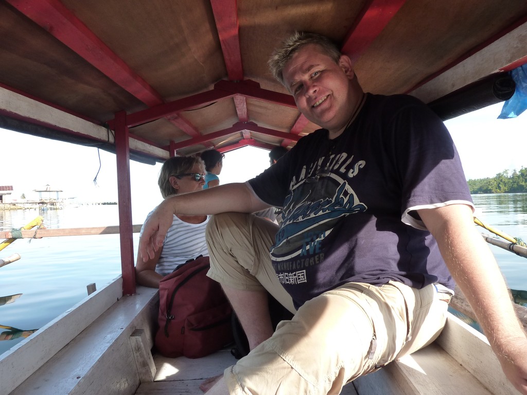 Hardy bringt uns direkt zum Jetty der kleinen Dingis, vorbei und mitten durch die zahlreichen „Geier“, die vor der großen Fähre schon auf die Neuankömmlinge warten und „ihr“ Resort bzw. Boot als das ultimative Ziel aller Reisewünsche anpreisen. Wir wollen nicht bis zum Nachmittag auf die öffentliche Fähre nach Katupat warten und stattdessen ein kleines Privatboot nehmen. An Bord der Fähre hatte Hardy tatsächlich noch zwei weitere Mitreisende mit gleichem Ziel gefunden. Ein holländisches Ehepaar will ebenfalls zum Fadhila Cottages, so dass sich ein Fahrpreis für die einstündige Überfahrt von rund 5 Euro pro Person ergibt.