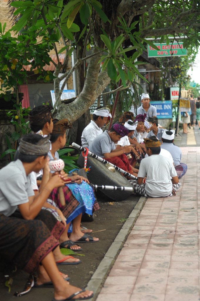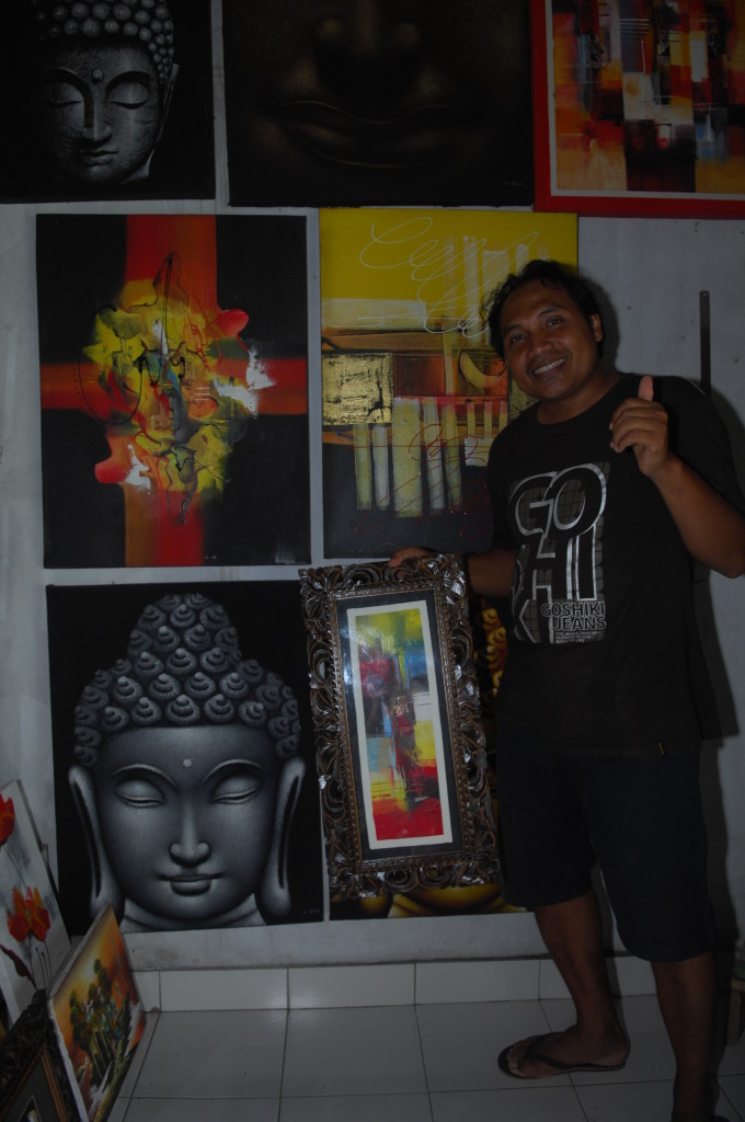 Je näher man der Stadtgrenze kommt, desto breiter wird der Trampelpfad, der schließlich sogar zu einem befestigten Weg mutiert, auf dem uns jetzt Radfahrer und später auch wieder die unvermeidlichen Mopeds entgegen kommen. Einige Künstler haben ebenfalls entlang des Weges durch die Reisfelder ihre Hütten aufgeschlagen. Darunter auch Nyoman Sudira, der nicht nur klassische kolorierte Tuschezeichnungen im typischen balinesischen Stil anfertigt, sondern auch auf Leinwand mit Acrylfarbe sehenswerte Gemälde im Stil der klassischen Moderne malt.