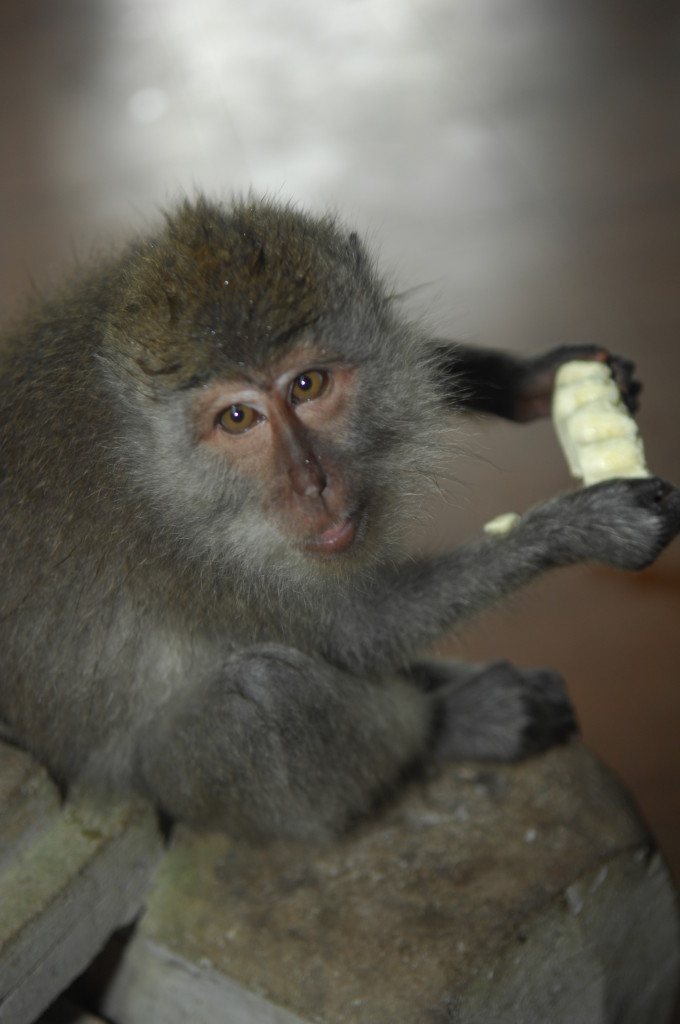 Von einer beschaulichen Fütterung kann jedoch nicht die Rede sein. Kaum entdecken die Affen etwas Essbares in den Händen der Menschen, wechselt es mit wenig List und mächtig Tücke den Besitzer. Da hilft es nichts, die Tüte mit den Erdnüssen hochzuhalten. Ein Sprung mit ausgestrecktem Arm und Ratsch, schon hat die Tüte ein Loch und die Nüsse fallen zu Boden. Dann zählt nur noch die Rangfolge im Rudel, wer wann und wieviel vom Mitbringsel bekommt.