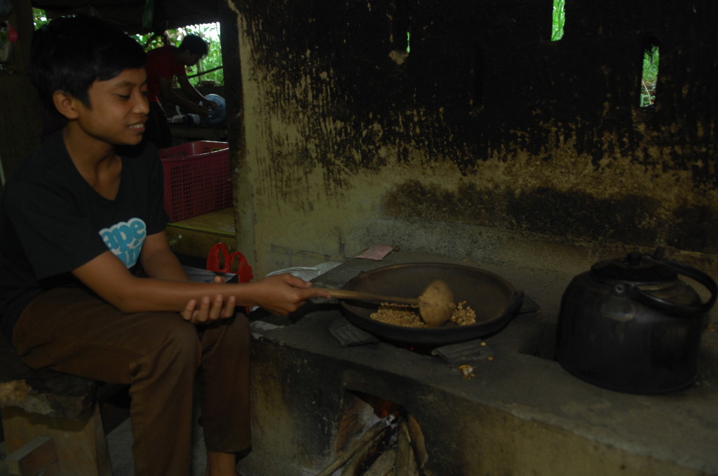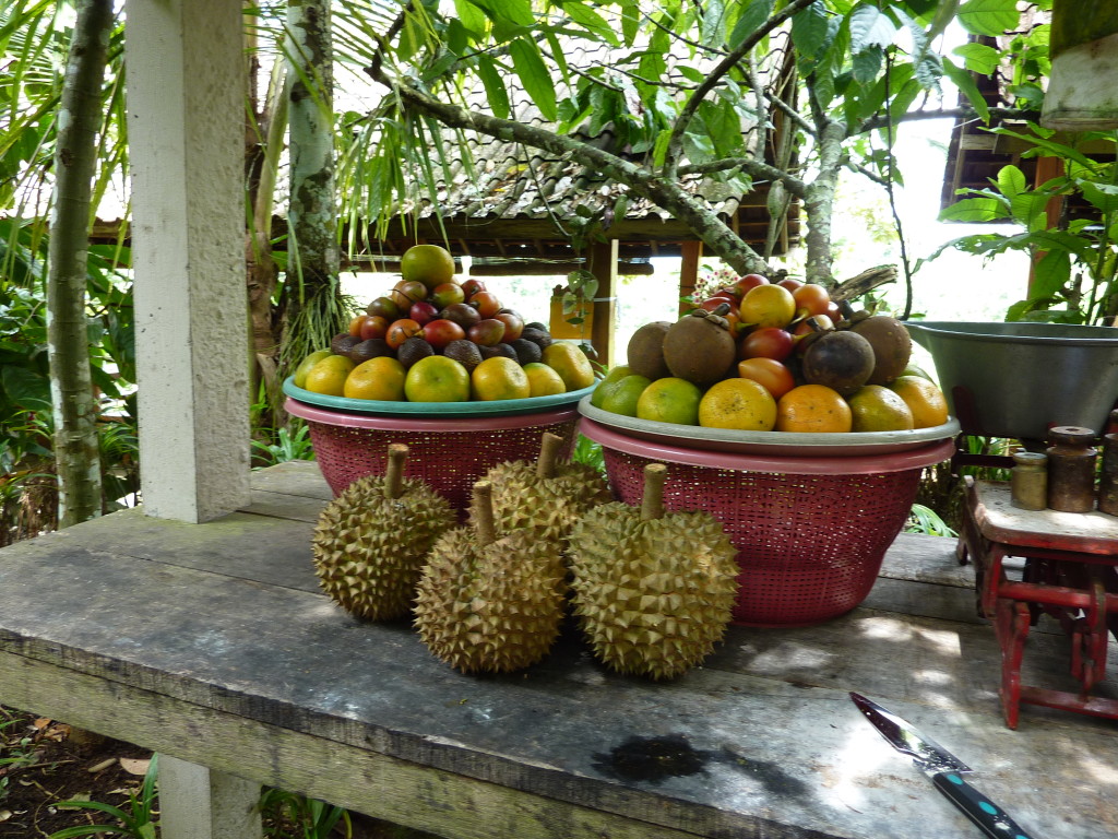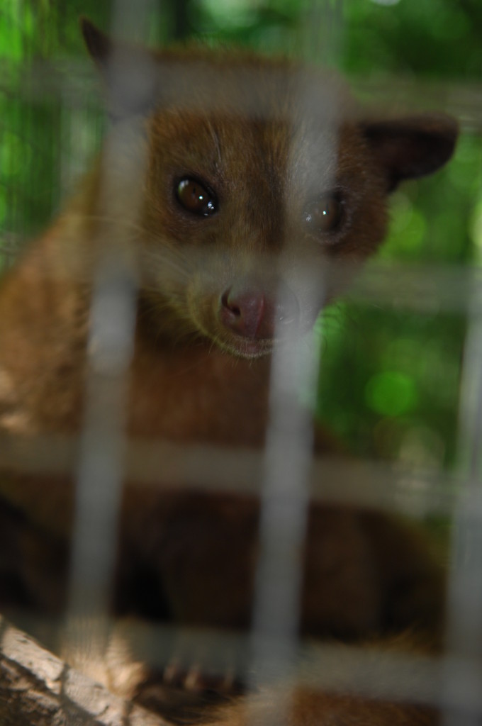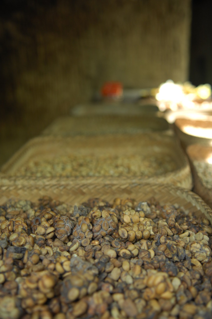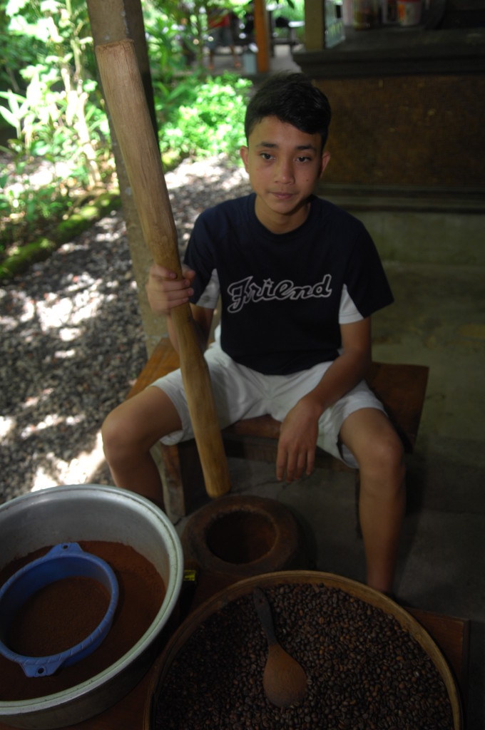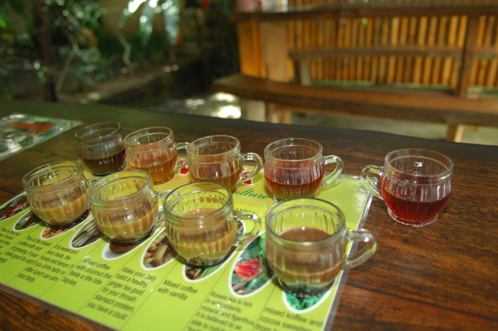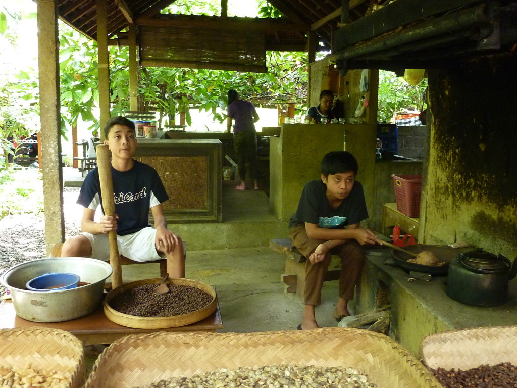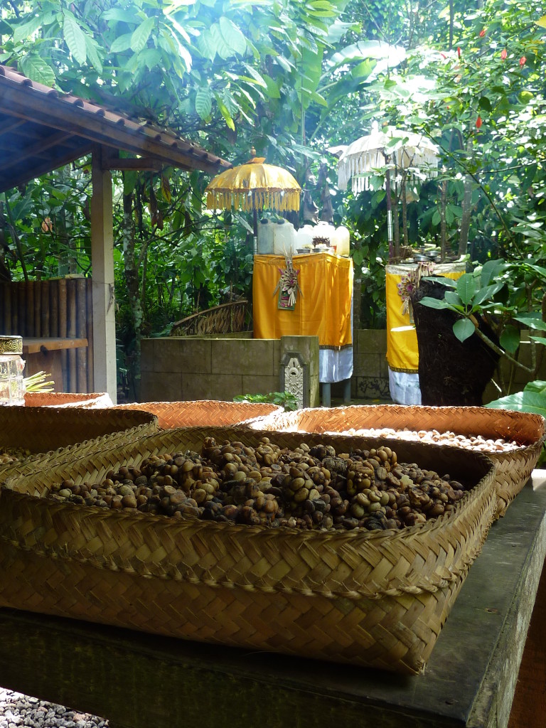 Diese in Südostasien verbreitete Schleichkatzenart wird mit reifen Kaffeekirschen gefüttert. Die Verdauung sorgt dann für die gewünschte spezielle Art der Fermentierung: die unverdaulichen Bohnen werden von dem Tier ausgeschieden, eingesammelt, gereinigt und schließlich geröstet. Die aufwendige Prozedur hat ihren Preis: 100g Luwak Coffee kosten rund 30 Euro. Uns genügt ein Probetässchen für 50.000 Rp. (3,30 Euro), das wir zusätzlich zu den Gratisproben diverser weiterer Kaffee-, Tee- und Kakaomischungen serviert bekommen.