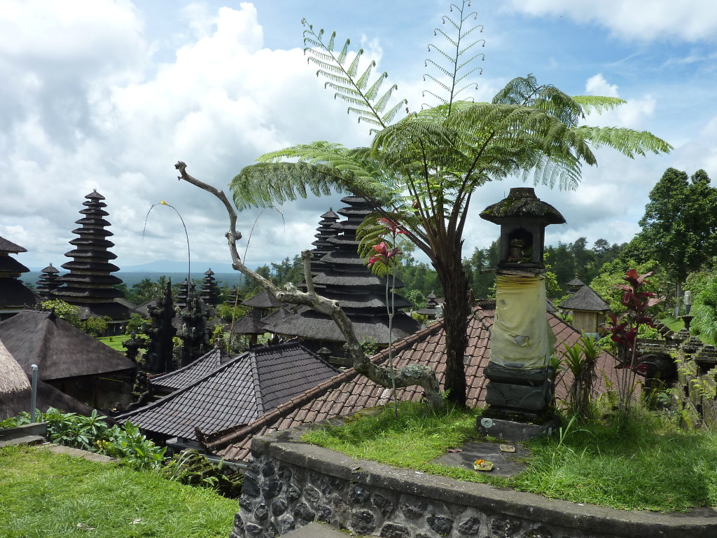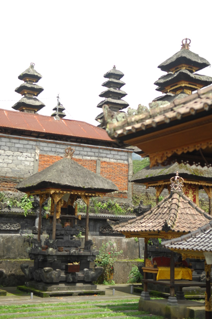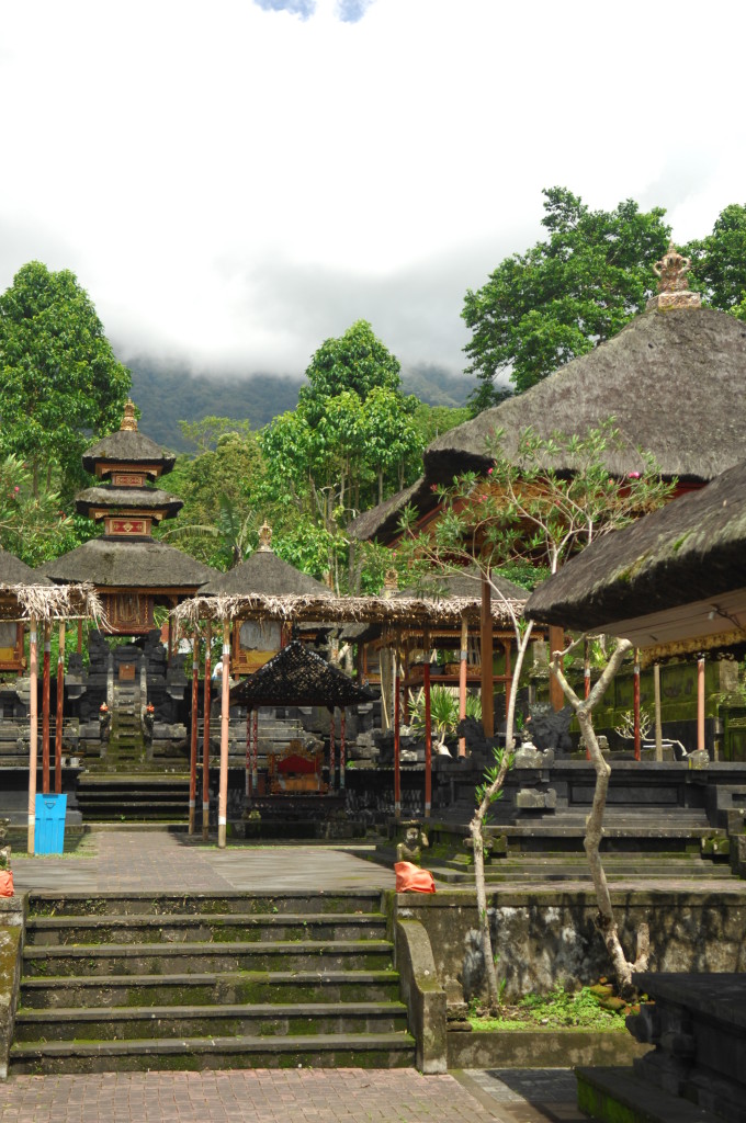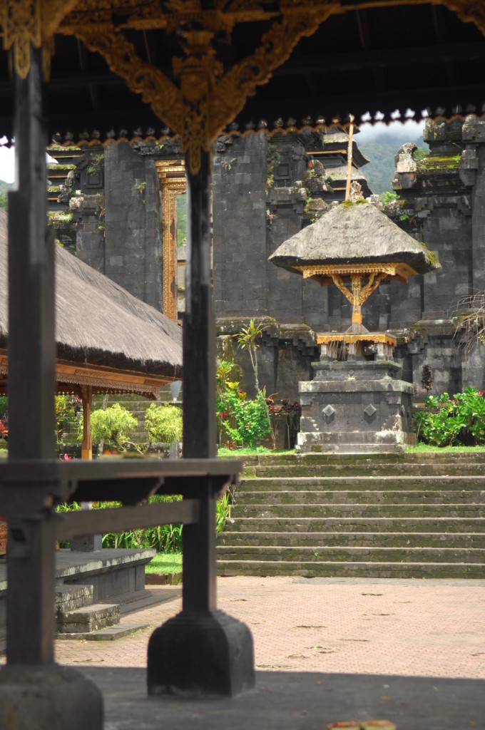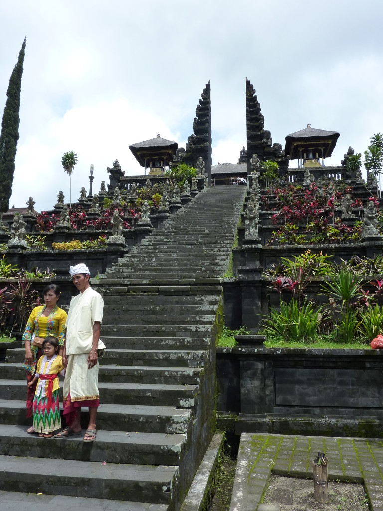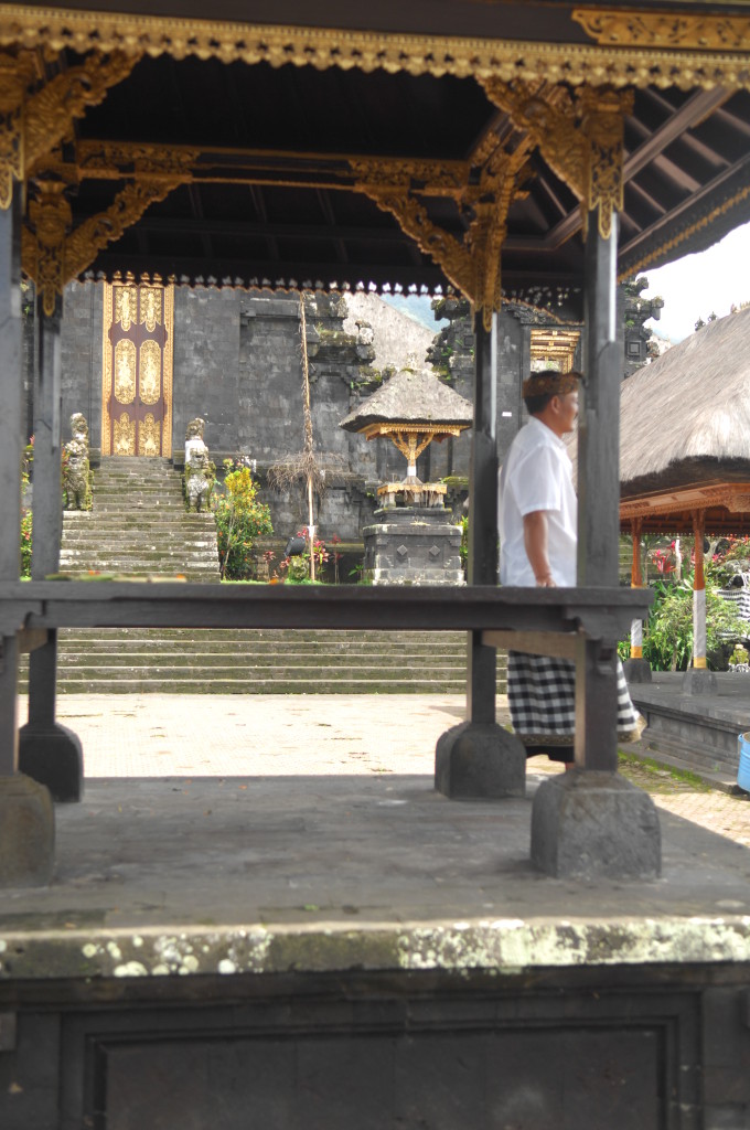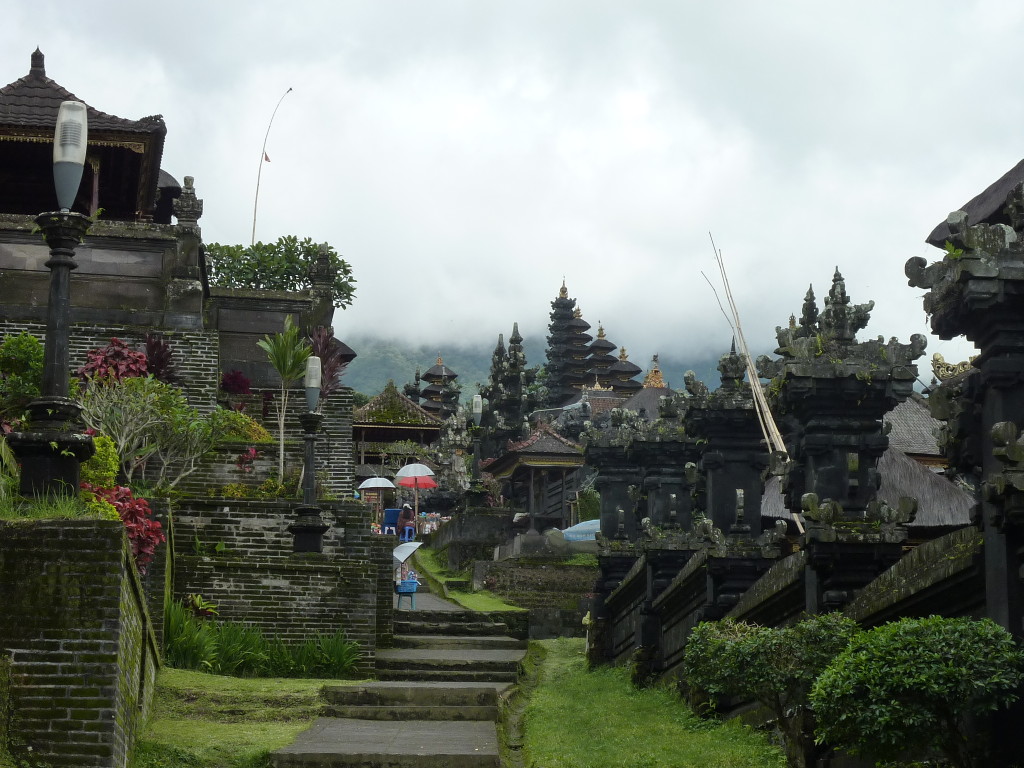Das bedeutendste hinduistische Heiligtum in Indonesien ist der Pura Besakih. Dieser „Muttertempel“ aller Tempel liegt am Fuß des ebenfalls aktiven Vulkans Gunung Agung. Bevor wir gegen Mittag vom Parkplatz zu der eigentlichen Anlage mit den über 200 Gebäuden gehen können, müssen wir an der „Touristeninformation“ unsere am Ortseingang gekauften Eintrittskarten entwerten lassen. Damit nicht genug: dem unbedarften Besucher wird das Engagieren eines lokalen Guides nahegelegt. Nur mit diesem dürfe der Tempelbezirk betreten werden – was zwar prinzipiell nicht ganz falsch, aber eigentlich nicht unbedingt notwendig ist. Für die Besichtigung reicht es völlig aus, den Pfad direkt an den niedrigen Mauern der Tempelplätze entlangzugehen und von dort aus in die Höfe zu schauen. Dafür benötigt man aber keine bezahlte Tempelwache, geschweige denn einen teuren Guide. Das vorgelegte „Gästebuch“ weist „Spenden“ führungswilliger Touristen der letzten Tage bzw. Stunden aus, die für die angebotenen Dienste 30 Euro und mehr ausgaben. Zum Vergleich: Der Eintritt zum Gesamtareal kostet derzeit 15.000 Rp. (1 Euro).