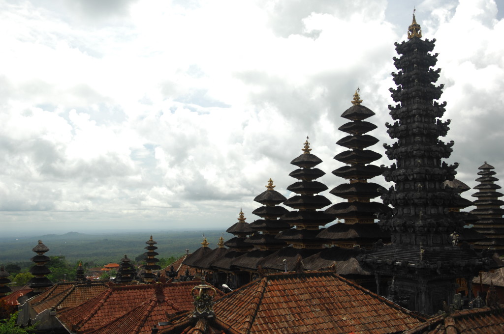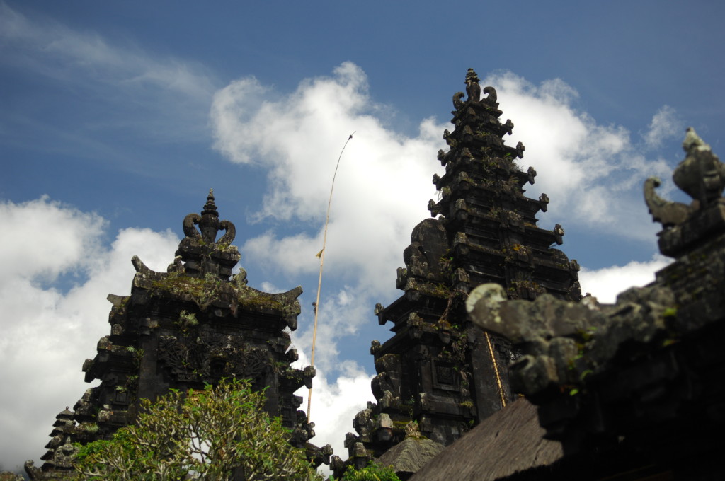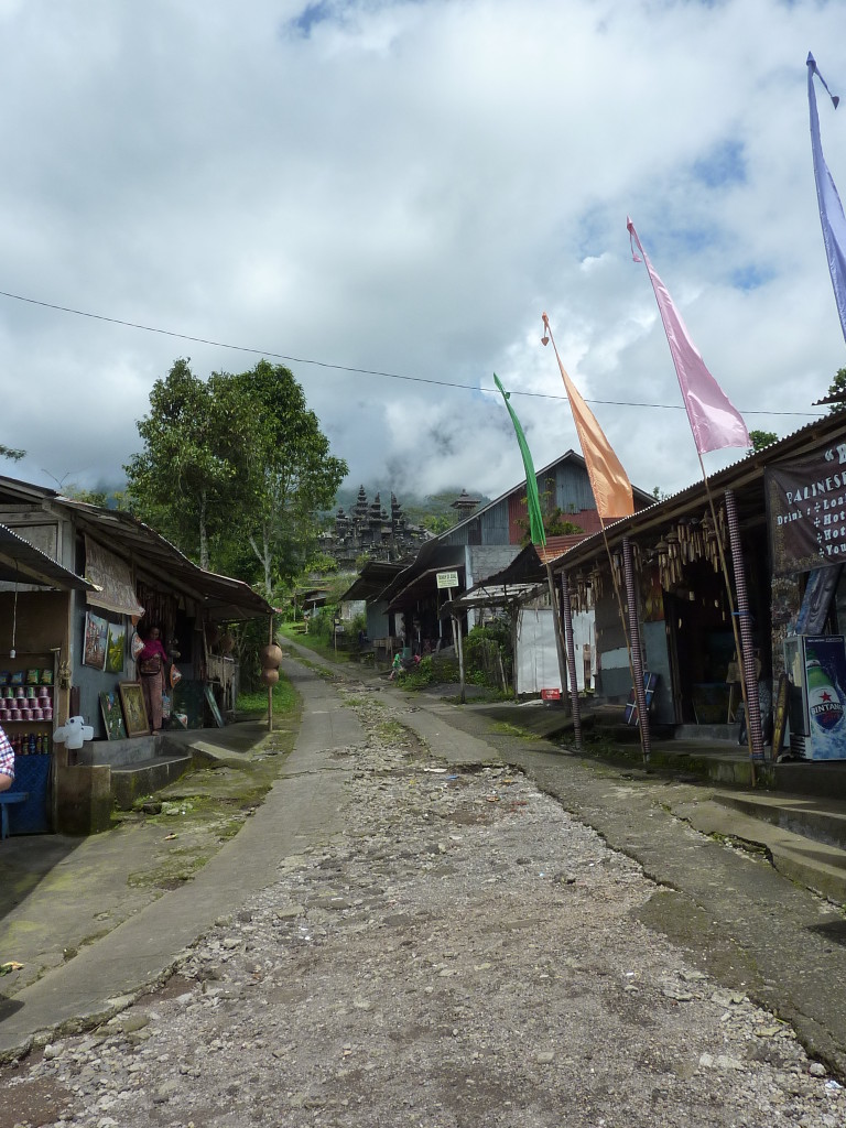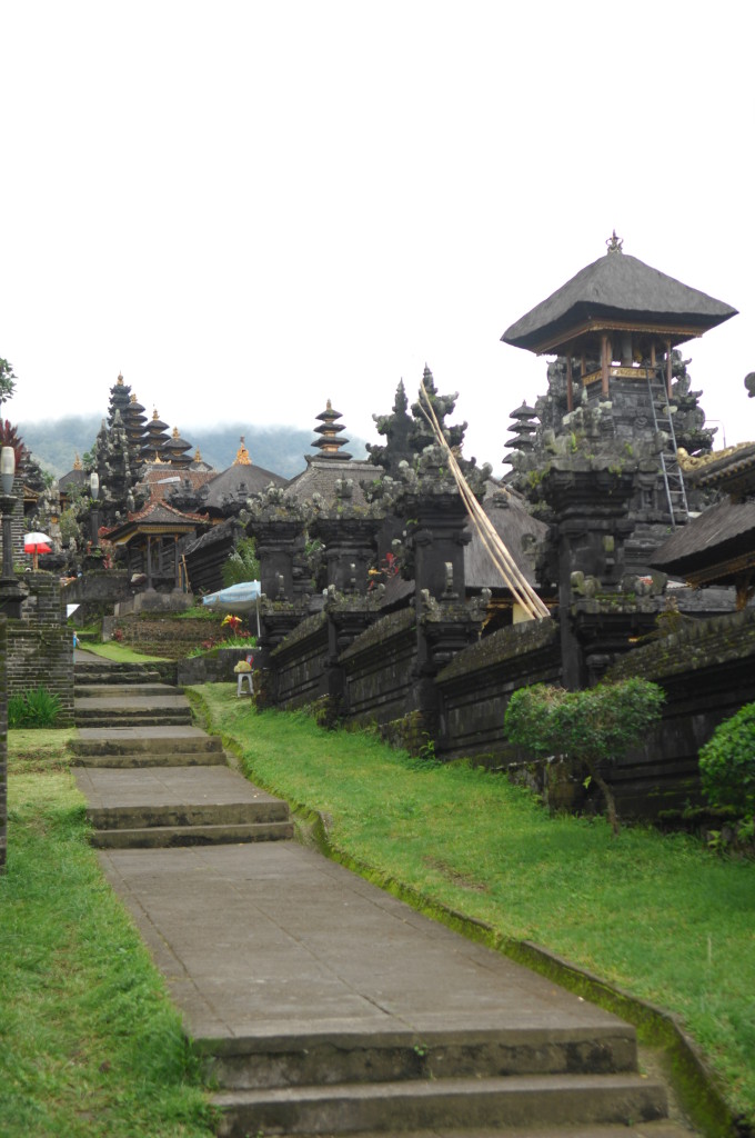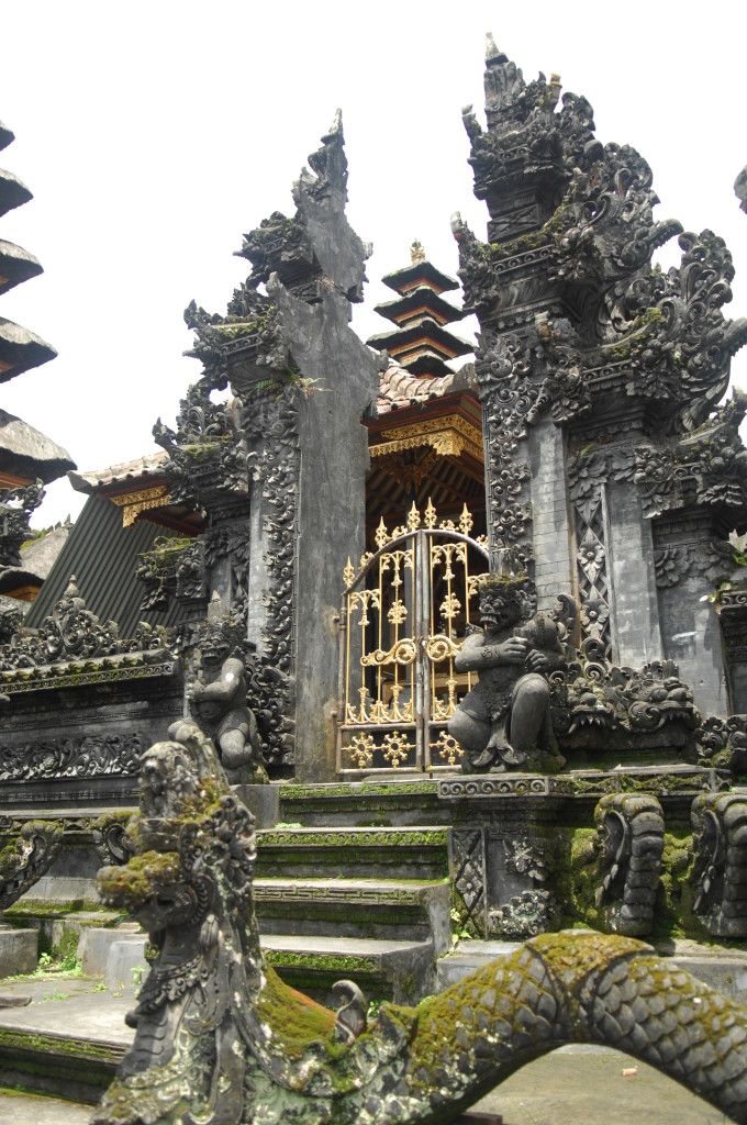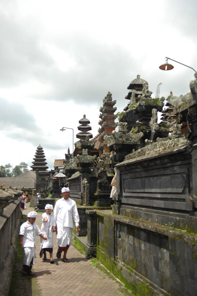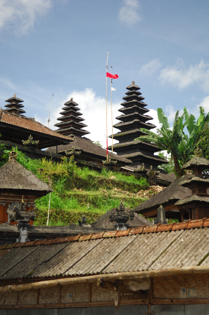 Das bedeutendste hinduistische Heiligtum in Indonesien ist der Pura Besakih. Dieser „Muttertempel“ aller Tempel liegt am Fuß des ebenfalls aktiven Vulkans Gunung Agung. Bevor wir gegen Mittag vom Parkplatz zu der eigentlichen Anlage mit den über 200 Gebäuden gehen können, müssen wir an der „Touristeninformation“ unsere am Ortseingang gekauften Eintrittskarten entwerten lassen. Damit nicht genug: dem unbedarften Besucher wird das Engagieren eines lokalen Guides nahegelegt. Nur mit diesem dürfe der Tempelbezirk betreten werden – was zwar prinzipiell nicht ganz falsch, aber eigentlich nicht unbedingt notwendig ist. Für die Besichtigung reicht es völlig aus, den Pfad direkt an den niedrigen Mauern der Tempelplätze entlangzugehen und von dort aus in die Höfe zu schauen. Dafür benötigt man aber keine bezahlte Tempelwache, geschweige denn einen teuren Guide. Das vorgelegte „Gästebuch“ weist „Spenden“ führungswilliger Touristen der letzten Tage bzw. Stunden aus, die für die angebotenen Dienste 30 Euro und mehr ausgaben. Zum Vergleich: Der Eintritt zum Gesamtareal kostet derzeit 15.000 Rp. (1 Euro).