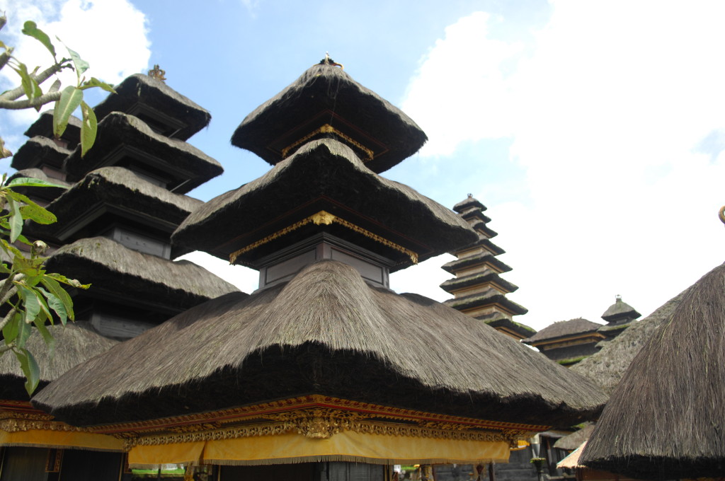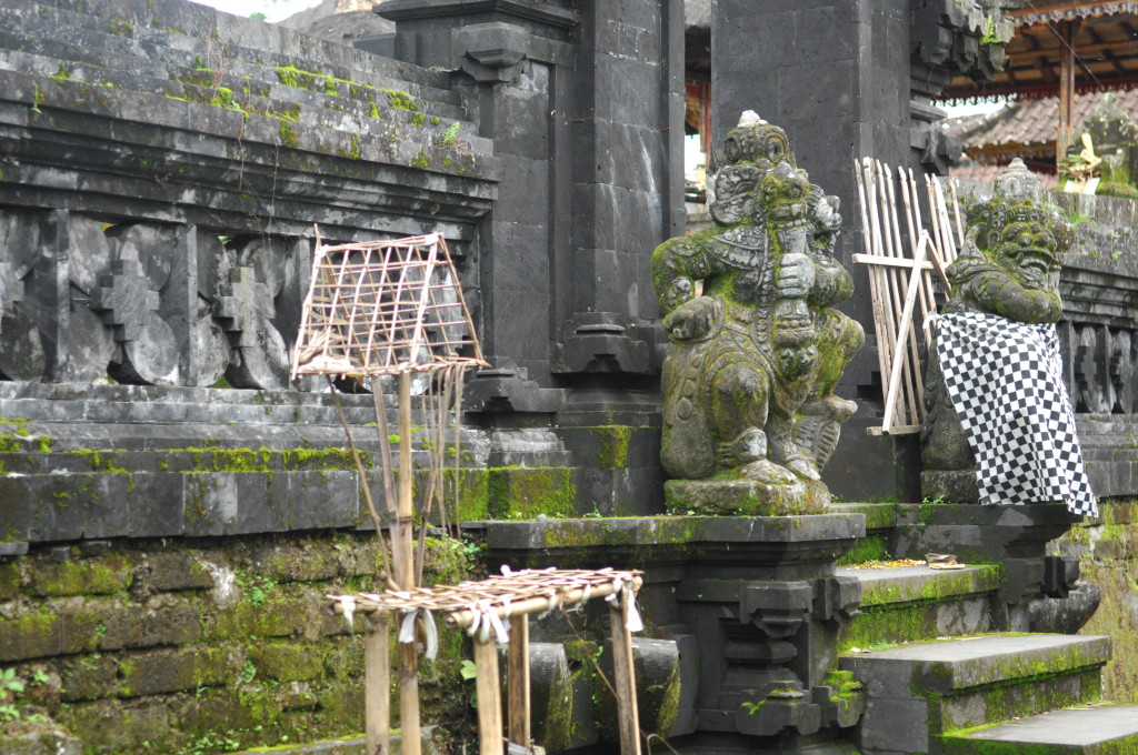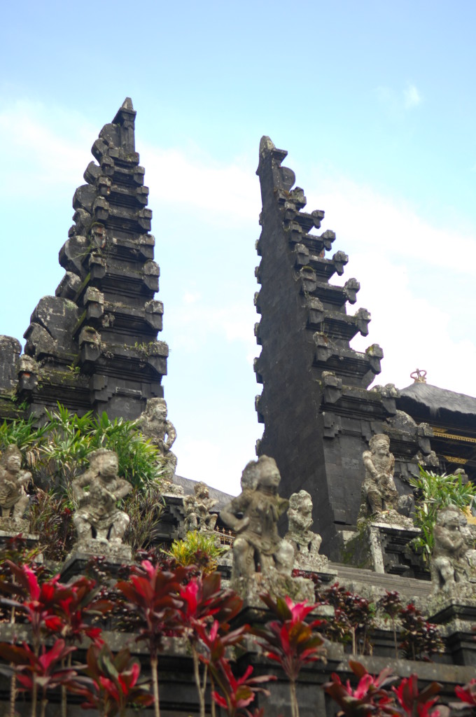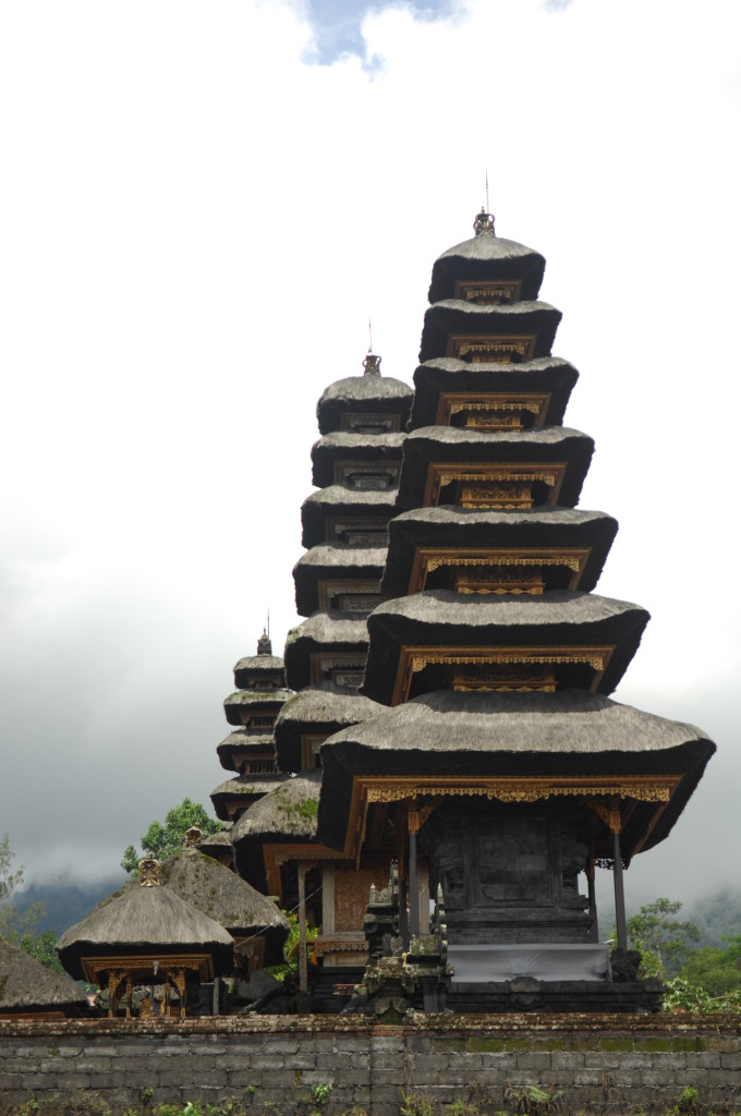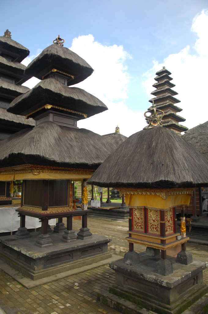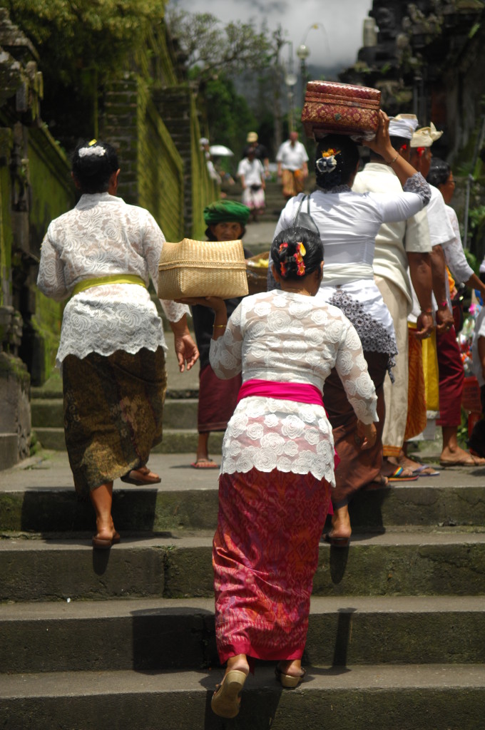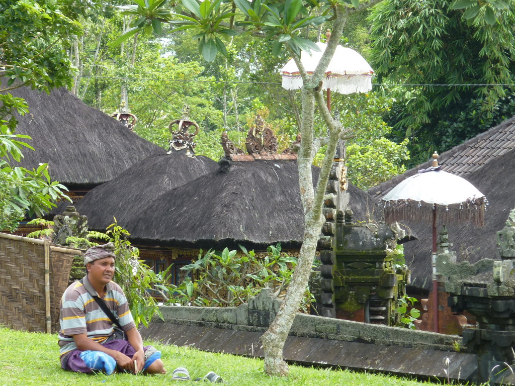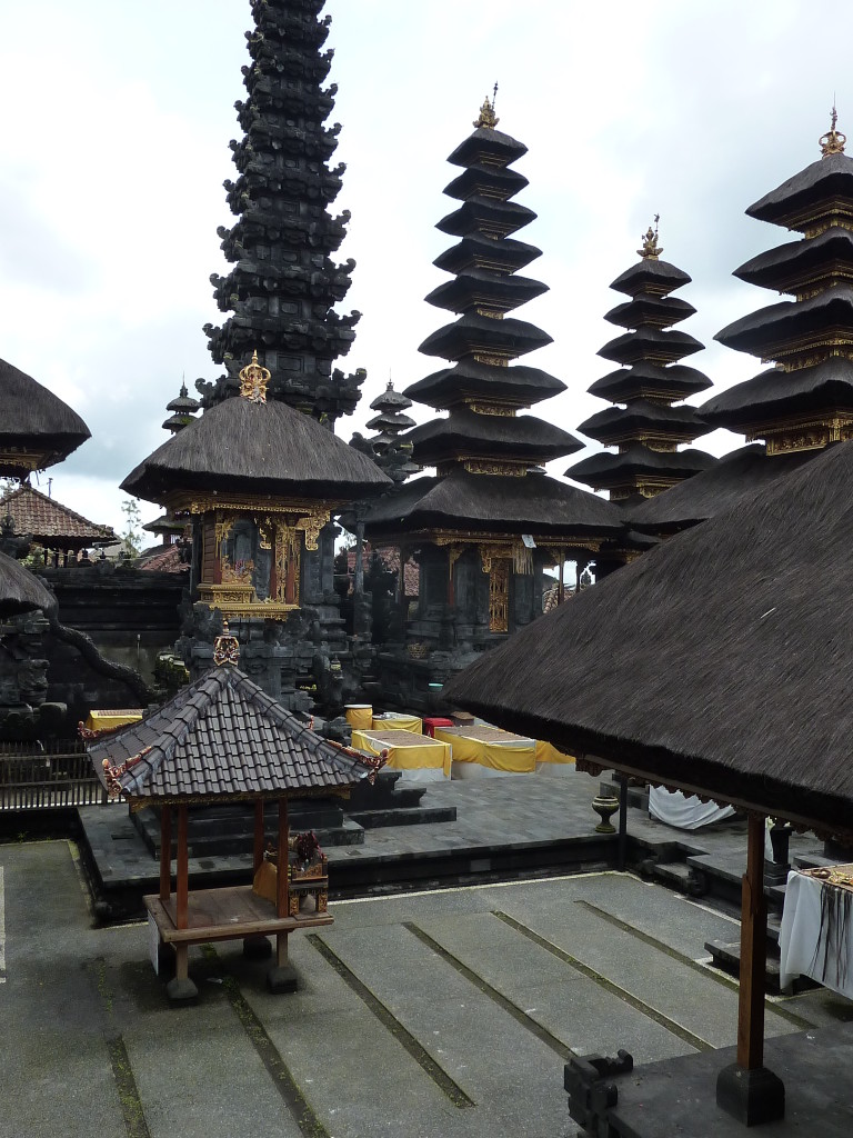 Das bedeutendste hinduistische Heiligtum in Indonesien ist der Pura Besakih. Dieser „Muttertempel“ aller Tempel liegt am Fuß des ebenfalls aktiven Vulkans Gunung Agung. Bevor wir gegen Mittag vom Parkplatz zu der eigentlichen Anlage mit den über 200 Gebäuden gehen können, müssen wir an der „Touristeninformation“ unsere am Ortseingang gekauften Eintrittskarten entwerten lassen. Damit nicht genug: dem unbedarften Besucher wird das Engagieren eines lokalen Guides nahegelegt. Nur mit diesem dürfe der Tempelbezirk betreten werden – was zwar prinzipiell nicht ganz falsch, aber eigentlich nicht unbedingt notwendig ist. Für die Besichtigung reicht es völlig aus, den Pfad direkt an den niedrigen Mauern der Tempelplätze entlangzugehen und von dort aus in die Höfe zu schauen. Dafür benötigt man aber keine bezahlte Tempelwache, geschweige denn einen teuren Guide. Das vorgelegte „Gästebuch“ weist „Spenden“ führungswilliger Touristen der letzten Tage bzw. Stunden aus, die für die angebotenen Dienste 30 Euro und mehr ausgaben. Zum Vergleich: Der Eintritt zum Gesamtareal kostet derzeit 15.000 Rp. (1 Euro).