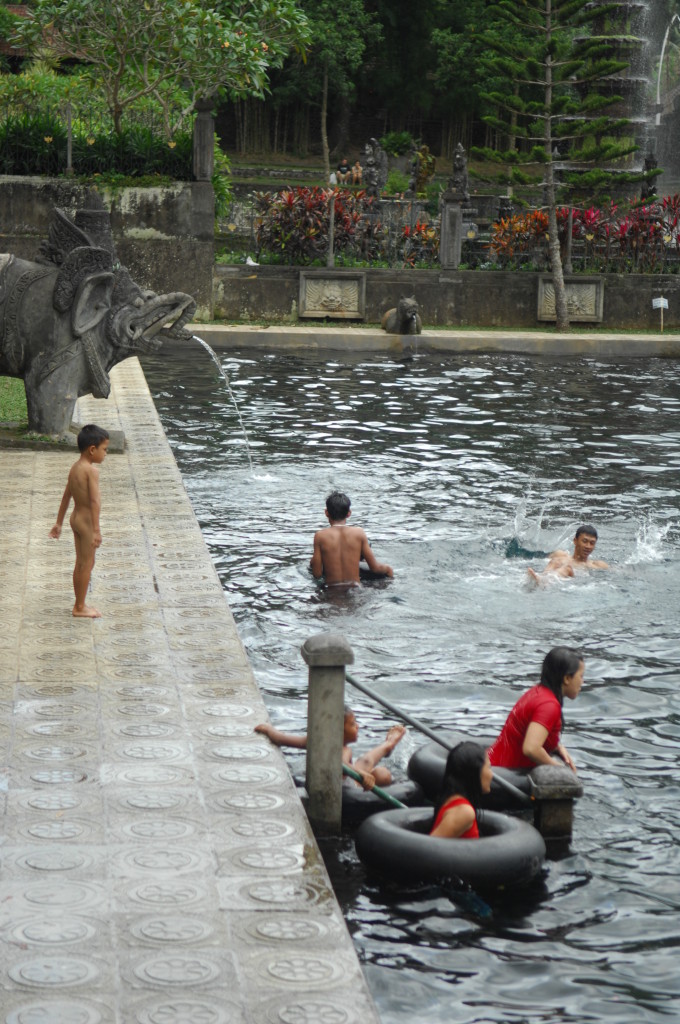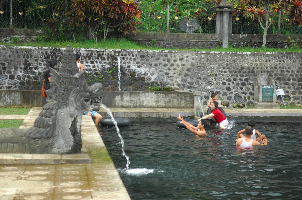 In den unteren Becken schwimmen Kois und Goldfische, das obere wird als Swimmingpool genutzt. Schwimmen ist ausdrücklich erlaubt, entsprechende Umkleidekabinen sowie Schwimmreifen für Nichtschwimmer stehen bereit und können gegen eine geringe zusätzliche Eintrittsgebühr von 10.000 Rp. (0,66 Euro) genutzt werden. Wer nicht im heiligen Wasser baden will, kann auch in den Kanälen außerhalb des Schwimmbeckens seine Füße in das besondere Nass tauchen und über den vorderen Teich laufen. Dazu sind in Schrittweite Steine im Becken eingelassen, von denen aus sich die wohlgenährten Kois optimal beobachten lassen.