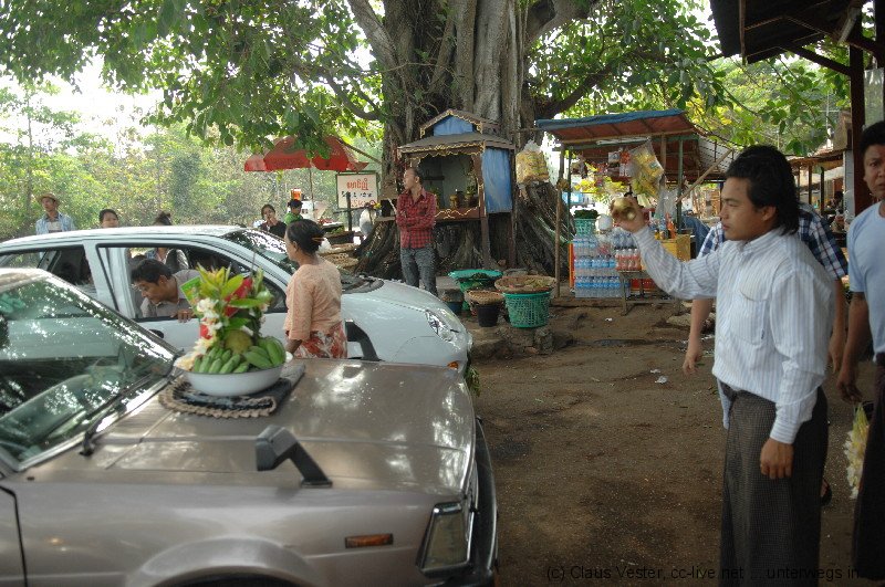 Des Rätsels Lösung: Neuwagenbesitzer, Taxifahrer und Geschäftsreisende kommen hierher, um ihre Fahrzeuge segnen zu lassen. Sie erhoffen sich unfallfreie Fahrten oder einfach nur gute Geschäfte mit den so gestärkten Autos. Eine Art animistischer TÜV also. I-Shwe Nyaung Bin (Golden Banyan Tree) heißt das Heiligtum.