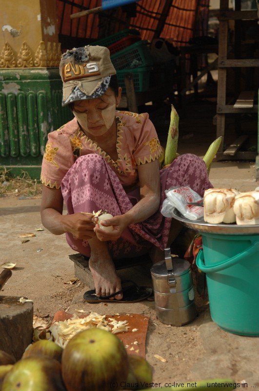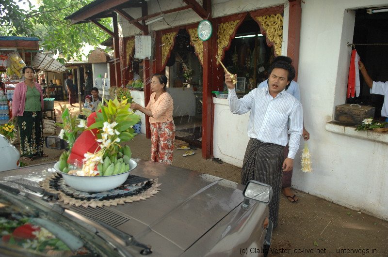 Heute beginnt unsere Fahrt mit Kyaw durch Myanmar. Mit dem Auto soll es zunächst von Yangon nach Mandalay gehen. Unser Guide und Fahrer wartet bereits vor dem Hotel. Bereits wenige Kilometer vor der Stadt machen wir Halt. Kyaw deutet verschwörerisch auf die andere Straßenseite. Ich soll meine Kamera mitnehmen. Er will mir später erklären warum. Vor einem Heiligtum verkaufen zwei Frauen Blumen, die offensichtlich als Opfergaben dienen. Doch sie werden nicht zum Altar gebracht, sondern auf der Motorhaube und am Kühlergrill der davor stehenden Autos befestigt. Dann erscheint ein Schamane und besprenkelt die Wagen unter dem Absingen monotoner Gebete mit Wasser, während die Fahrzeuge bockig dreimal ein paar Zentimeter vor und zurück ruckeln.