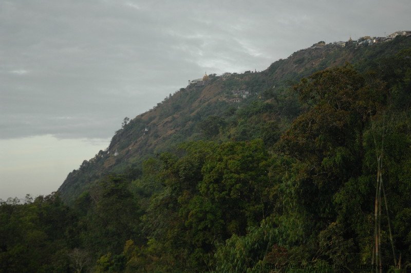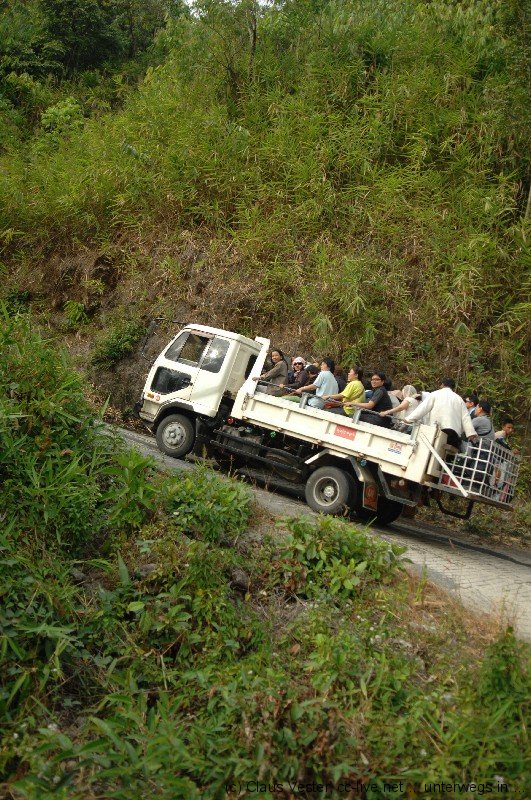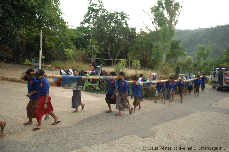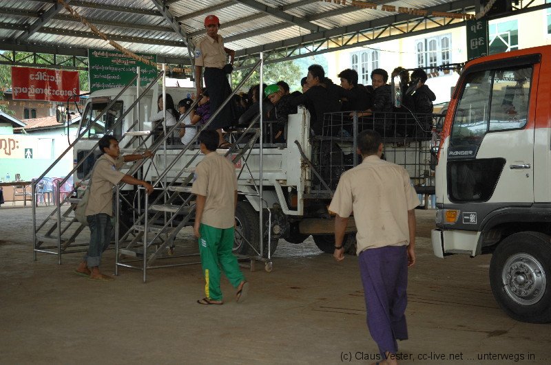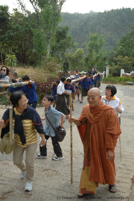 Gegen 14.30 Uhr erreichen wir Kimpun Camp, das erste Basislager für den Aufstieg zum Golden Rock. Hier heißt es Umsteigen. In einer Halle warten bereits zahlreiche LKW, auf deren Ladefläche hintereinander acht Bretter Platz für jeweils 6 Passagiere bieten. Sobald alle 48 Personen auf den provisorischen Bänken Platz genommen haben, beginnt die rasante Fahrt. Mit bis zu vierzig km/h bezwingen die allradgetriebenen LKW die kurvenreiche Bergstrecke. Das ist wie eine Achterbahnfahrt ohne Haltebügel. Kein Wunder, dass die Fahrer erst starten, wenn die Ladefläche auch wirklich voll ist. So zusammengequetscht hält jeder jeden. Unterbrochen von einem kurzen Zahlstopp – der Transport kostet 1500 Kyat (1,5 €) – endet die Fahrt nach ungefähr 45 Minuten im zweiten Basislager, von dem aus es zu Fuß weitergeht. Nur Einheimische dürfen die gesamte Stecke bis ganz nach oben auf dem LKW fahren. Touristen haben die Wahl, sich für 20 US$ von vier Trägern auf einer Art Sänfte bergauf schleppen zu lassen. Wir entscheiden uns tapfer für die klassische Pilgervariante, schultern die Rücksäcke – die man sich natürlich auch von geschäftstüchtigen Sherpas hätte hinaufschleppen lassen können – und zweifeln schon bald an unserem Wagemut. Der Anstieg ist verdammt steil. Da beruhigt es schon sehr, dass auch die Jugendlichen, die mit uns auf dem LKW saßen, nicht viel schneller sind und ebenfalls zahlreiche Pausen einlegen. Kurz vor Sonnenuntergang erreichen wir schließlich völlig durchgeschwitzt das Kyaikhto Hotel unweit der Eingangspforte zum Golden Rock.