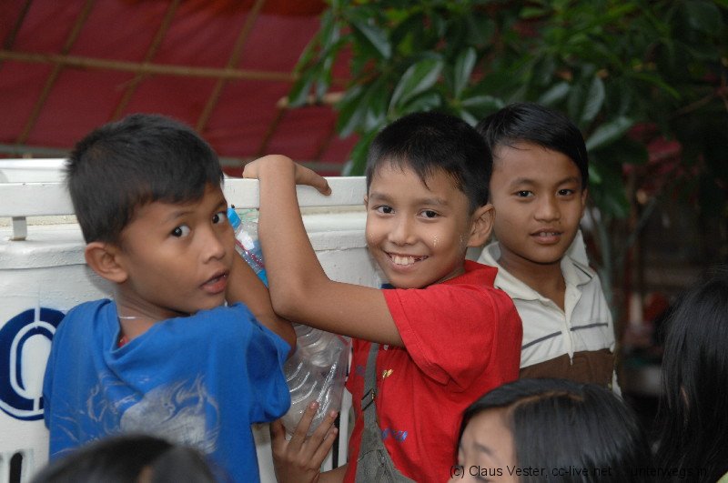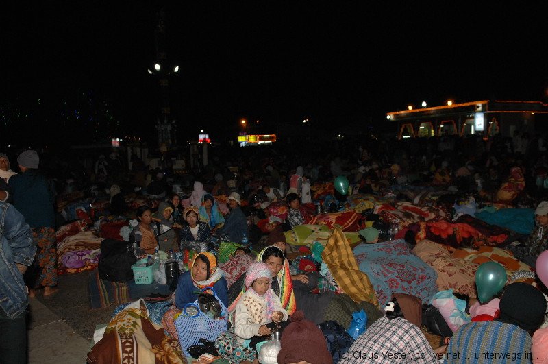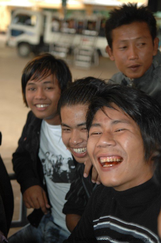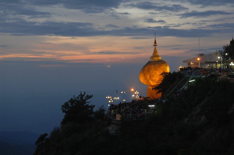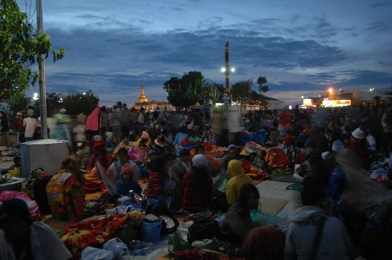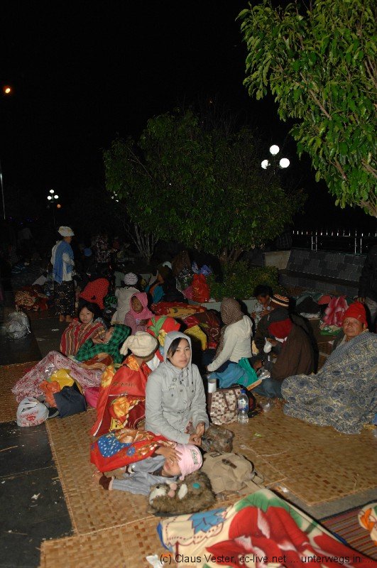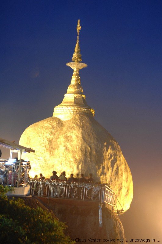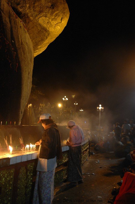 Auf dem Platz campieren bereits tausende Pilger, die wohl den ganzen Tag über hier eingetroffen sein müssen. Jetzt haben sie es sich auf Bambusmatten und mit Decken auf den Marmorfliesen des großen Platzes vor dem zentralen Heiligtum bequem gemacht. Der Wind it bereits empfindlich kühl, doch der einzigartigen Stimmung tut das kleinen Abbruch. Wir scheinen die einzigen Touristen zu sein, die sich um diese Zeit unter die in der Mehrzahl jugendlichen Einheimischen gemischt haben. Es ist eine tiefe, ehrliche Frömmigkeit gepaart mit unbändiger Fröhlichkeit und Lebensfreude, die über allem spürbar ist. Es gibt keinen Platz, wo wir den Heiligen Abend in diesem Jahr sonst verbringen wollten – ein unvergessliches Erlebnis. Durch eine schmale Gasse kämpfen wir uns durch die Pilgerscharen und dann ist es endlich soweit: wir steigen die Stufen neben dem Golden Rock hinab, wo vor allem Frauen unterhalb des überhängenden Felsbrockens Räucherwerk opfern und ihre Gebete sprechen. Nur den Männern ist es erlaubt, über eine kleine Holzbrücke oberhalb zu dem Fels zu gelangen und diesen mit Blattgold zu belegen. Zurück im Hotel sitzen wir noch ein wenig im kühlen Wind auf der Terrasse neben unsrem Zimmer und genießen den Blick auf den Golden Rock, der wie ein Leuchtfeuer in die tiefschwarze Nacht scheint. Von den Menschenmassen auf dem Platz ist nur ein weit entferntes wogendes Murmeln zu hören. Und dass die vorgelagerten Pilgerheime bunt wie Disneyland flackern gehört einfach auch zu diesem Ort, wo Frömmigkeit und Lebensfreude in dieser Nacht zu einer unvergleichlichen Mischung fügten.