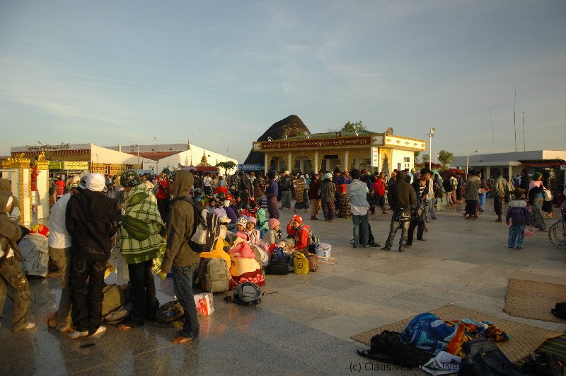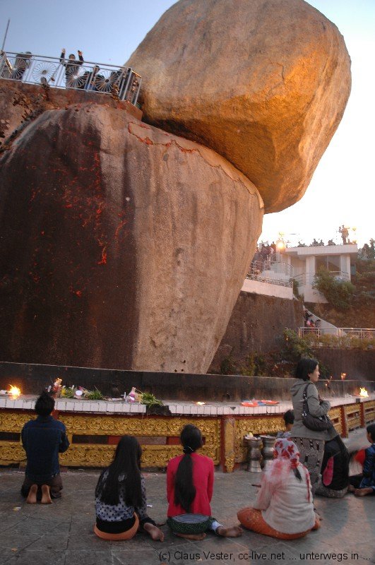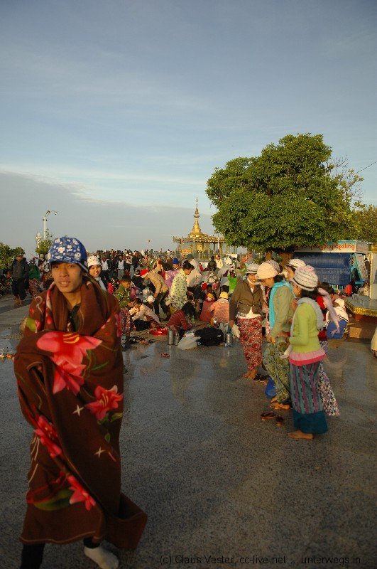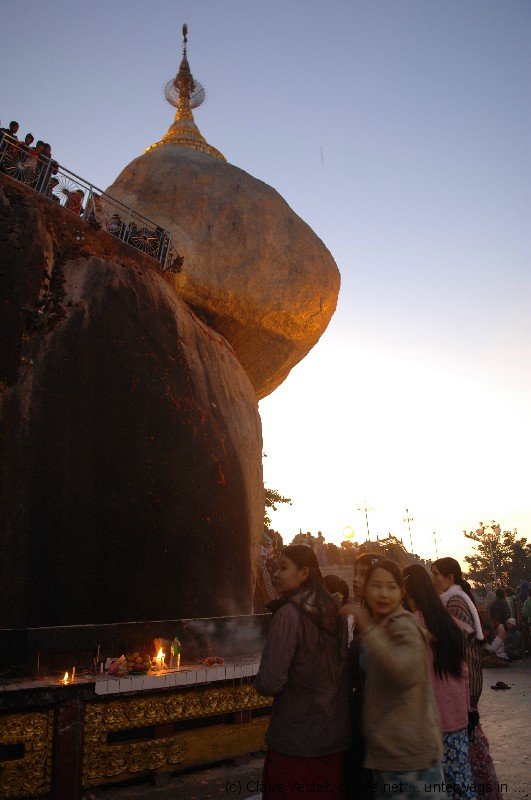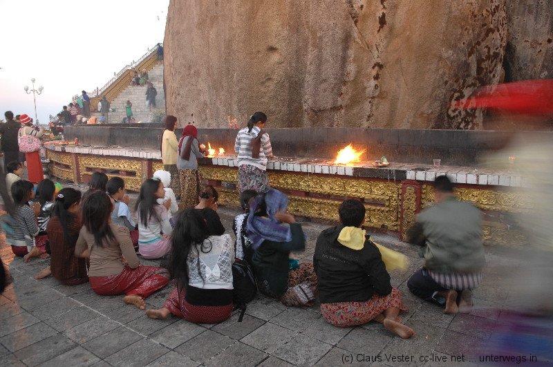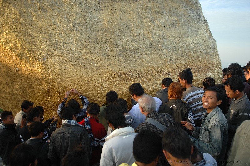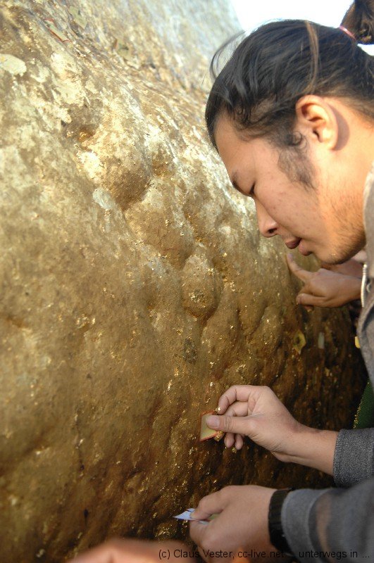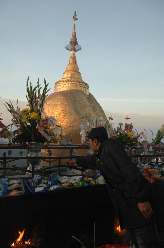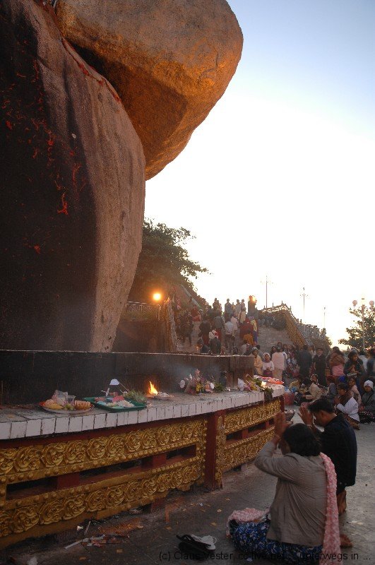 Aufstehn um 5.45 Uhr und gleich hoch zum Golden Rock. Der Platz leert sich bereits ein wenig. Viele, die hier übernachtet haben, opfern jetzt bei Sonnenaufgang ein Tablett mit Früchten, Wasser und anderen Nahrungsmitteln – wichtig ist nur, dass es neun verschiedene sind. Und natürlich werden wieder jede Menge Räucherstäbchen abgebrannt. Wir haben Kyaw versprochen, das wir für ihn stellvertretend Blattgold am Golden Rock opfern und kaufen für je 6.000 Kyat vier Briefchen für ihn und uns.
