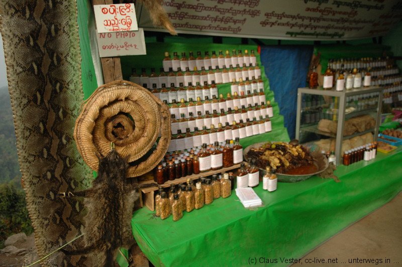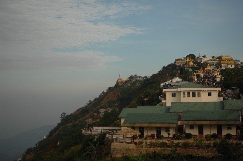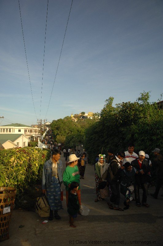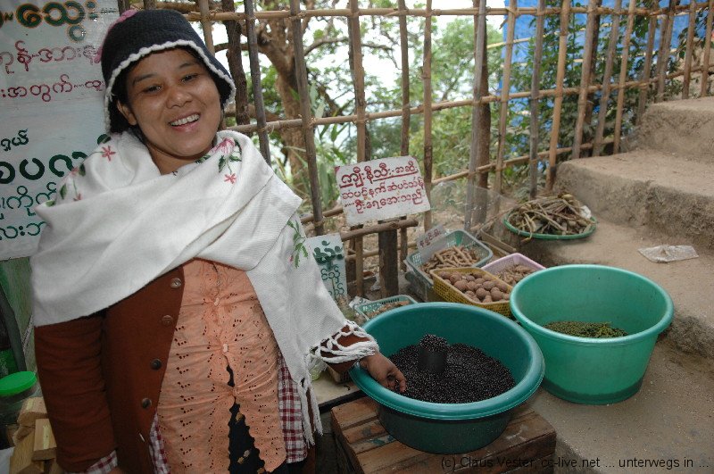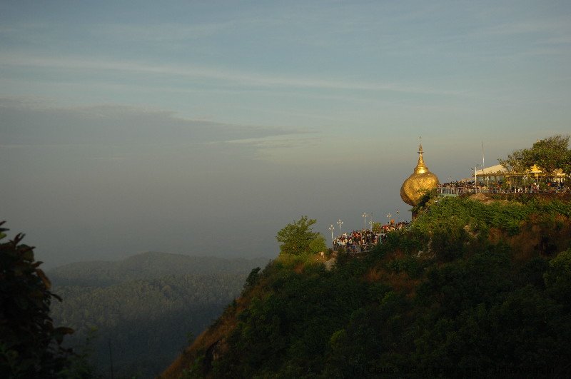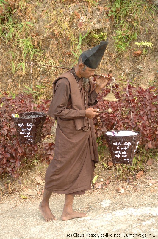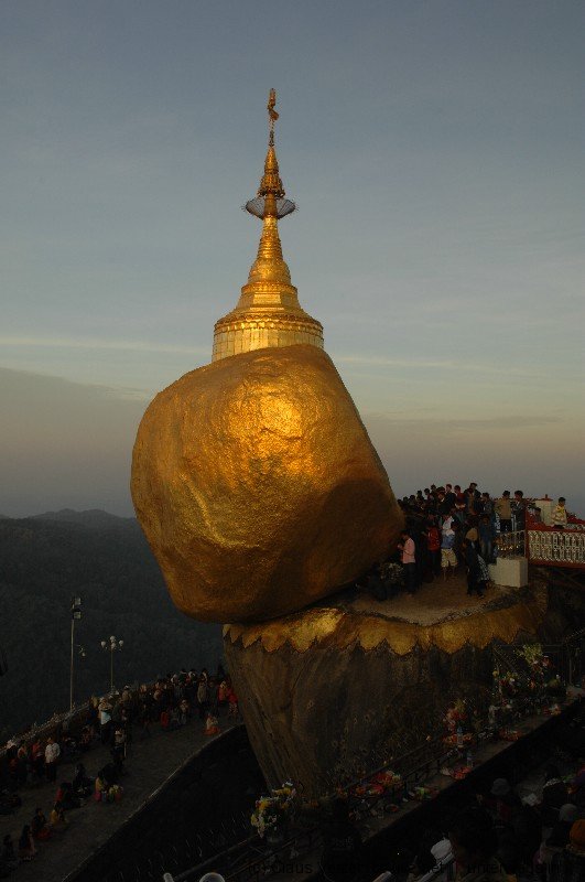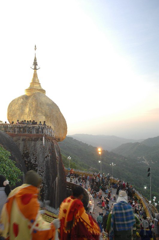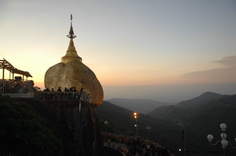 Aufstehn um 5.45 Uhr und gleich hoch zum Golden Rock. Der Platz leert sich bereits ein wenig. Viele, die hier übernachtet haben, opfern jetzt bei Sonnenaufgang ein Tablett mit Früchten, Wasser und anderen Nahrungsmitteln – wichtig ist nur, dass es neun verschiedene sind. Und natürlich werden wieder jede Menge Räucherstäbchen abgebrannt. Wir haben Kyaw versprochen, das wir für ihn stellvertretend Blattgold am Golden Rock opfern und kaufen für je 6.000 Kyat vier Briefchen für ihn und uns.