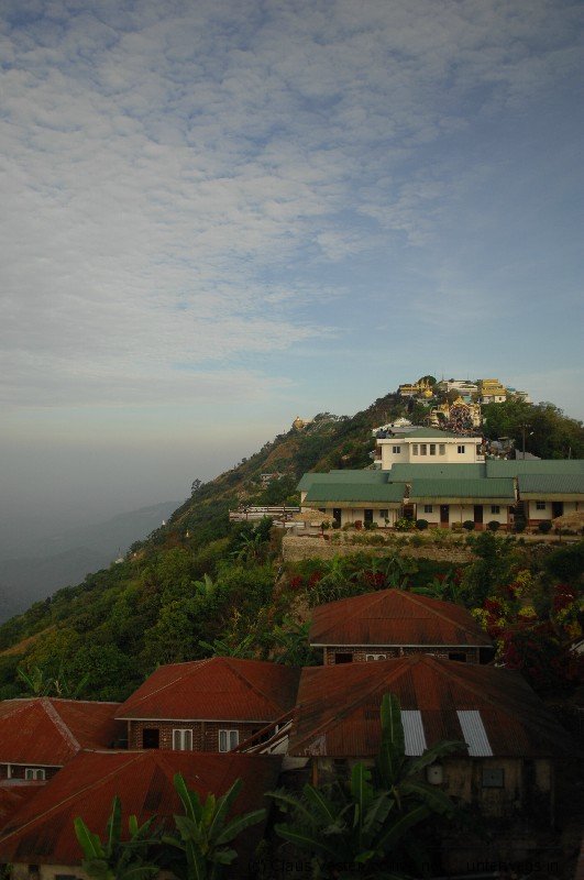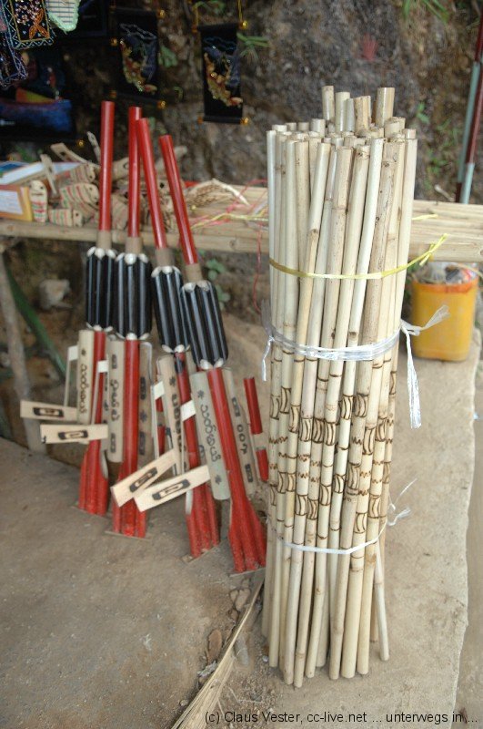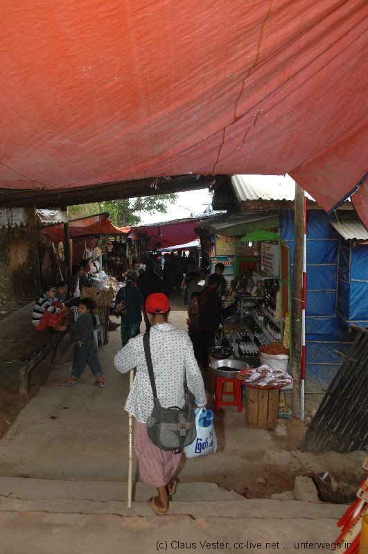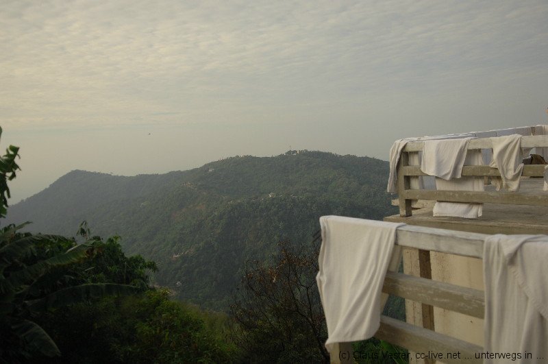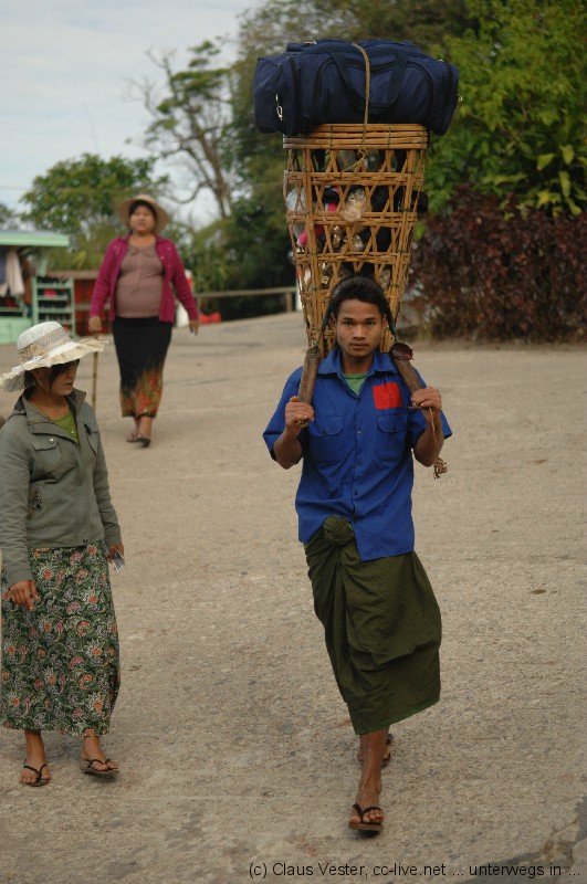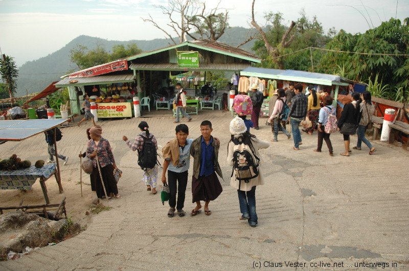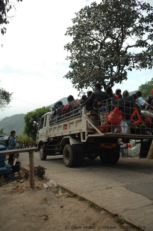 Zurück im Kyaikhto Hotel warten eine heiße Dusche und ein reichhaltiges Frühstück mit Toast, Spiegelei und Kaffee. Und dann heißt es wieder zurück zur Basisstation – natürlich wieder zu Fuß, Träger sind was für Weicheier und japanische Touristen. Für den Abstieg kaufen wir uns zwei Bambusstecken. Das hilft, die Knie zu entlasten. Nach 45 Minuten ist die zweite Basisstation erreicht und wir erkämpfen uns einen Platz auf den schmalen Pritschen der Allradtrucks. Unter dem ständigen Zischen der Bremsentlüftungen geht es zügig bergab, so dass wir nach nochmal 45 Minuten im unteren Basislager ankommen – etwas früher als geplant.