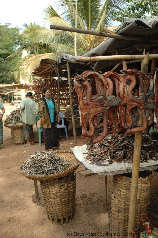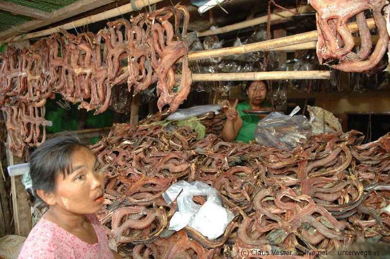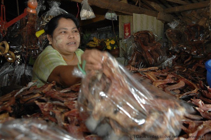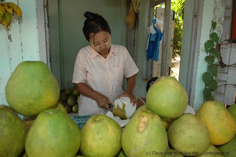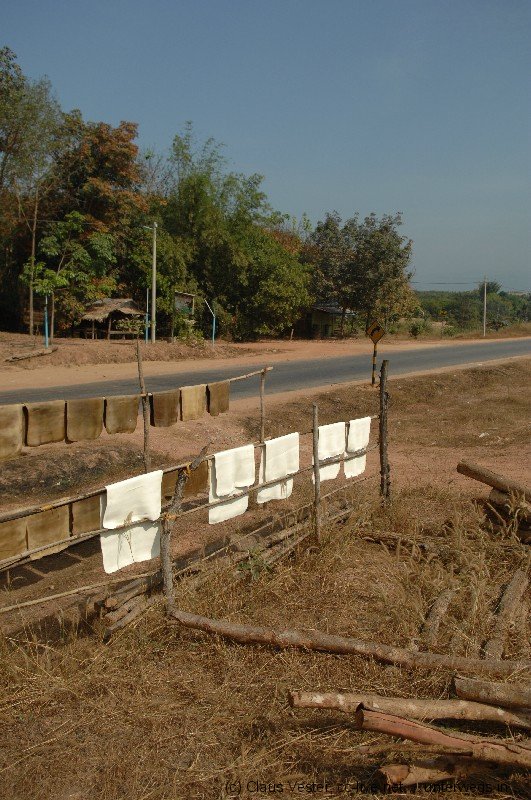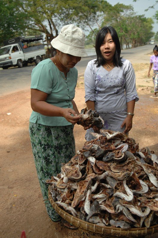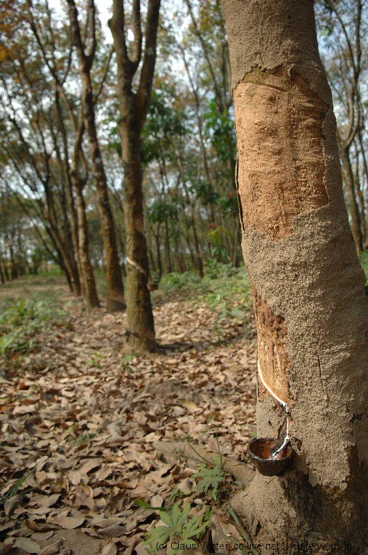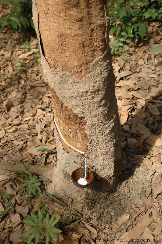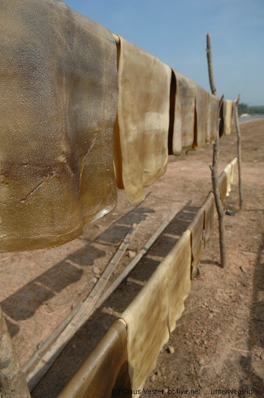 Kyaw ist 20 Minuten später am Treffpunkt und wir machen uns auf den Weg nach Toungoo, der heutigen Zwischenstation auf der Fahrt nach Mandalay. Nach einem kurzen Stopp und dem Genuss einer köstlichen, süßen Pomelo halten wir an einer der zahlreichen Kautschuk-Plantagen am Wegesrand kurz vor der Grenze des Mon-Staates. Die Bäume werden 35 Jahre alt bevor sie gefällt werden, der Saft kann ab dem siebten Jahr abgezapft werden. Die Schalen mit der zähen, weißen Flüssigkeit werden in den Morgenstunden geleert und in einem Container mit Wasser und Schwefelsäure vermischt. Am nächsten Tag wird der etwa 10 cm dicke Bodensatz durch Walzen gepresst, um einen Großteil der Flüssigkeit herauszupressen. Die nun etwa 5 mm dicken Lappen werden anschließend zum Trocknen aufgehängt. Dabei verfärben sie sich vom ursprünglichen milchigen Weiß in wenigen Tagen zu einem teilweise transparenten Braunschwarz. Je durchsichtiger sie sind und je geringer die Zahl der Einschlüsse, desto höher ist die Qualität des jetzt verkaufsfähigen Kautschuks.