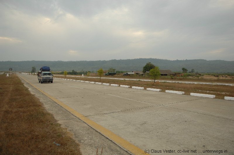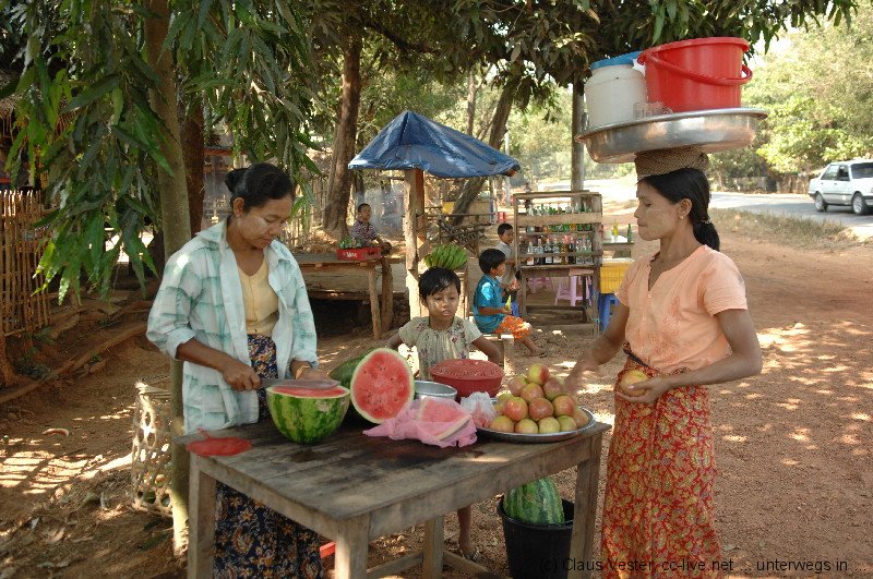 Nach einem weiteren kurzen Zwischenstopp an einem Handelsposten für Trockenfisch erreichen wir schließlich die Autobahn Yangon – Mandalay. Die genügt im Prinzip westlichen Standards, das Tempolimit liegt bei 100 km/h. Eine Autobahnraststätte entpuppt sich als Full-Service-Station. Neben einem halben Dutzend Restaurants – eins ist noch im Bau – gibt es auch zwei Werkstätten, die um Kundschaft buhlen. Und das Beste: eines der Restaurants hat sich auf Sushi und westlich Kaffeevariationen spezialisiert. Beim Trinken eines doppelten Espressos bzw. eines Milchkaffees müssen wir an Thomas aus der Schweiz denken, der sich in Mrauk U nach einem richtigen Kaffee anstelle der klebrig süßen Instantbrühe sehnte.
