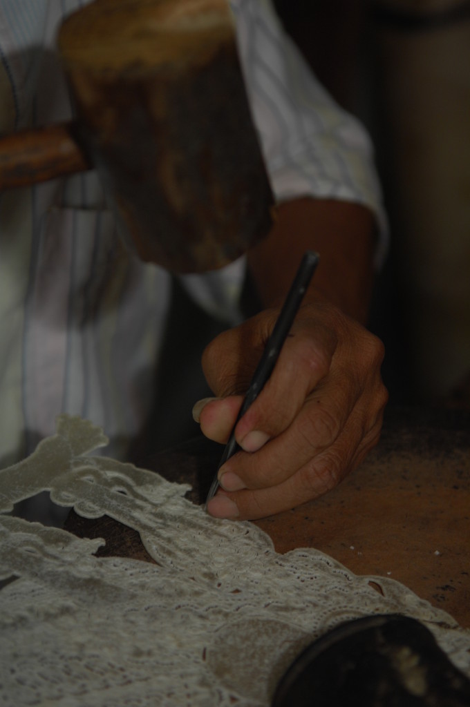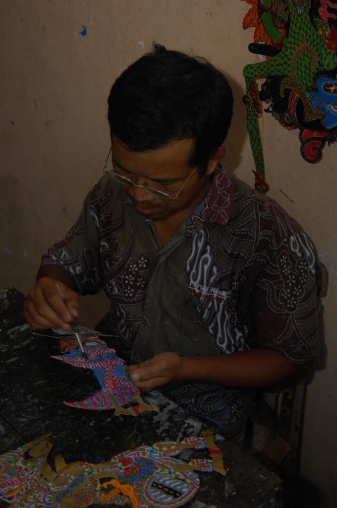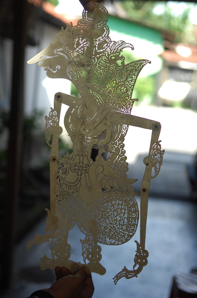 Die zweidimensionalen Wayang-Figuren für die Schattenspiele werden traditionell aus Büffelhaut gefertigt, in die filigrane Strukturen und Ornamente gestanzt werden. Anschließend werden sie bunt bemalt und die beweglichen Elemente montiert.