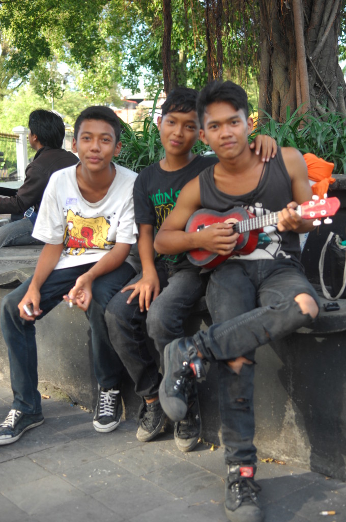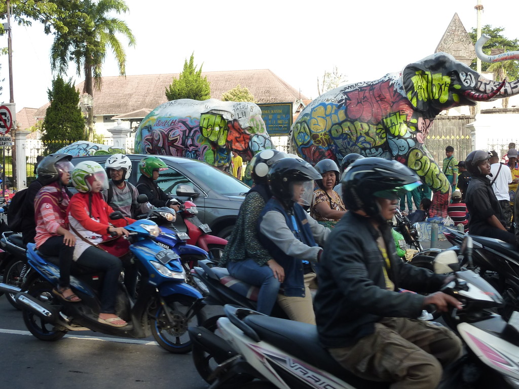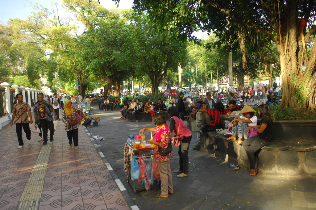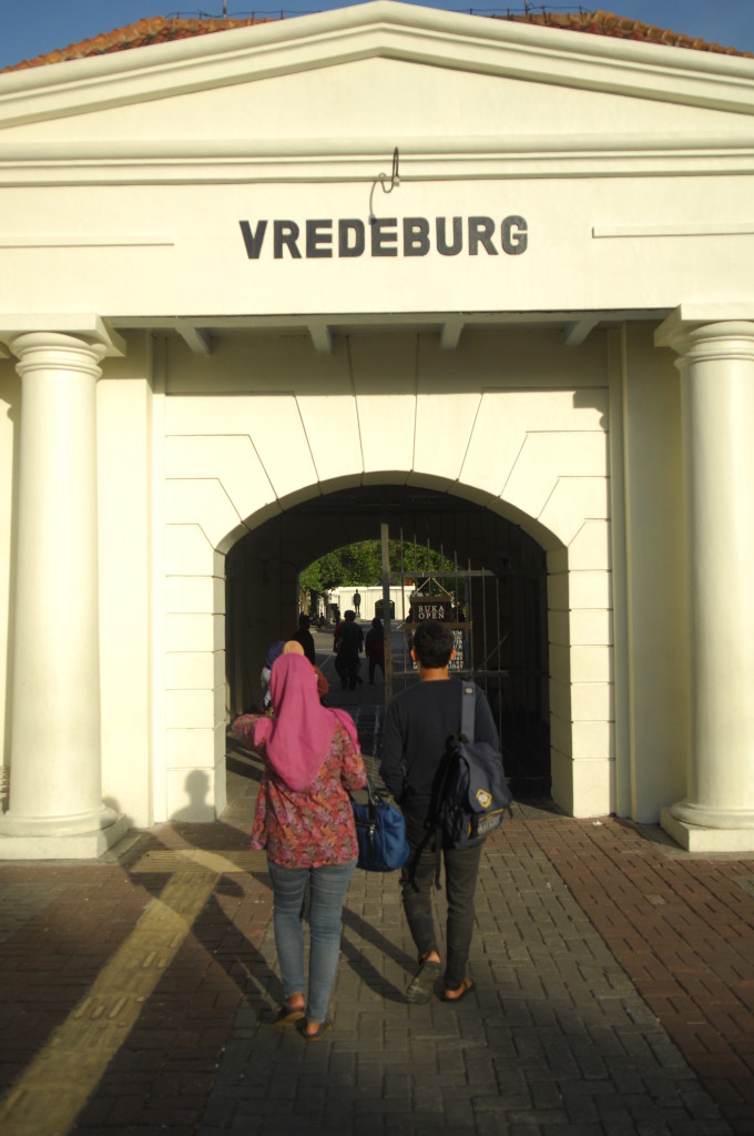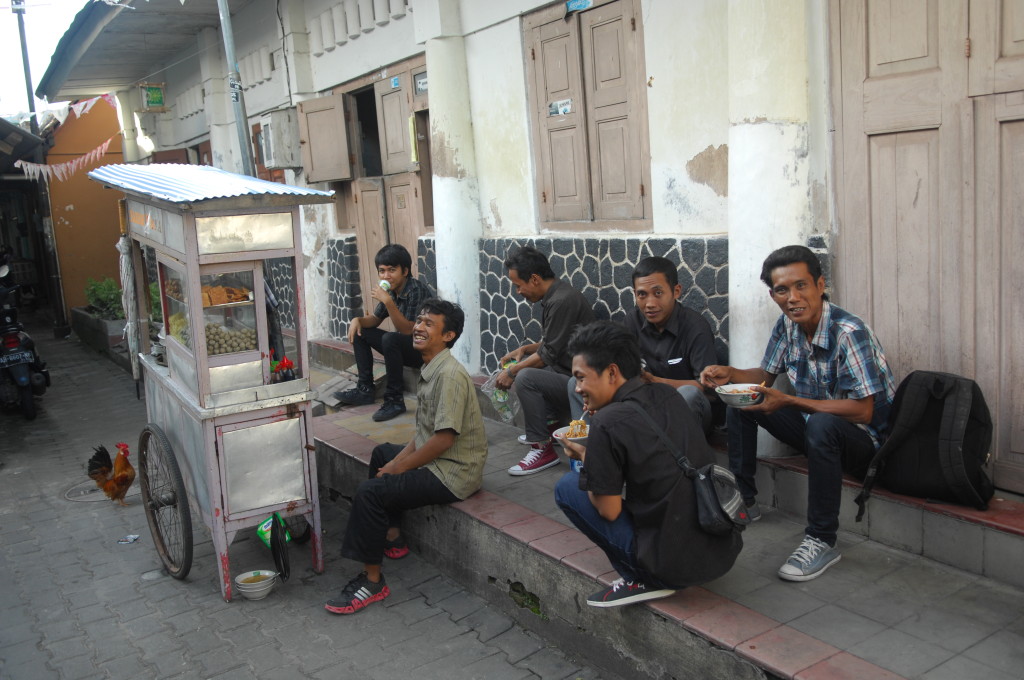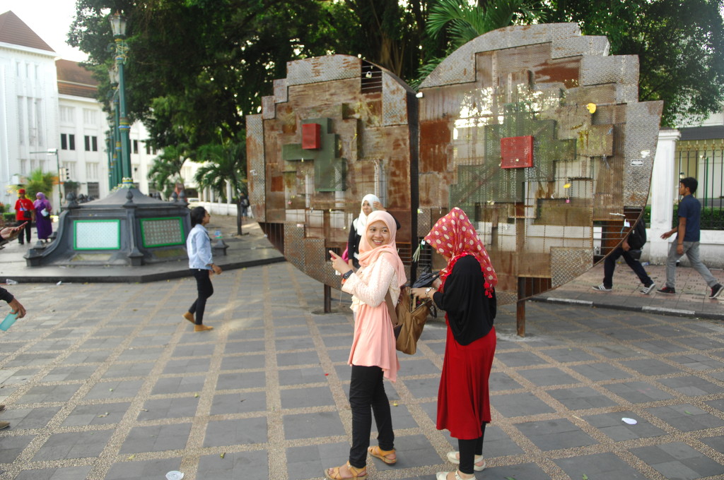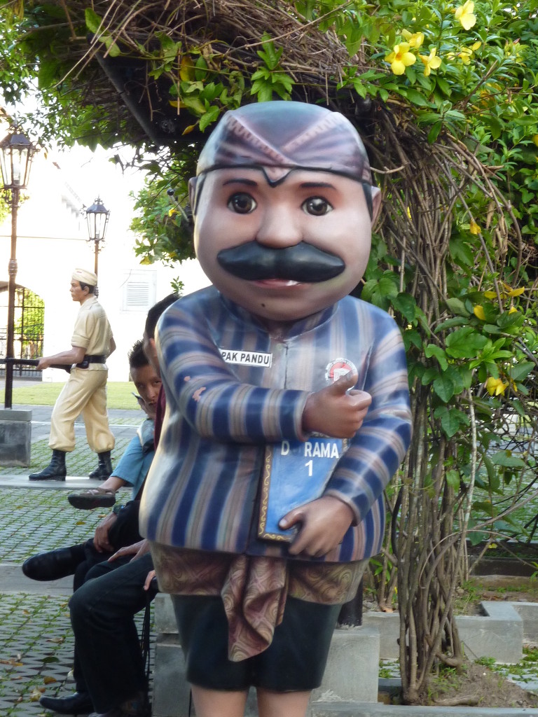 Unser Streifzug endet schließlich am Null Kilometer von Yogyarkata unweit der Vredeburg, einer Befestigungsanlage aus der holländischen Kolonialzeit. In den Baracken befinden sich rund 50 Dioramen, die die Geschichte vom Kampf um die Unabhängigkeit erzählen. Gegenüber der Festung befindet sich an der Jalan Malioboro der 0 Kilometer, eine ursprünglich für die Längenbestimmung aller Entfernungen Indonesiens genutzte Markierung. Es ist Samstagabend und bereits jetzt füllt sich der breite Gehweg mit Jugendlichen, die sich hier zum gemeinschaftlichen Abhängen, Sehen und Gesehenwerden treffen. Auch für Verpflegung ist gesorgt: auf kleinen Grills werden Saté und andere Snacks zubereitet.