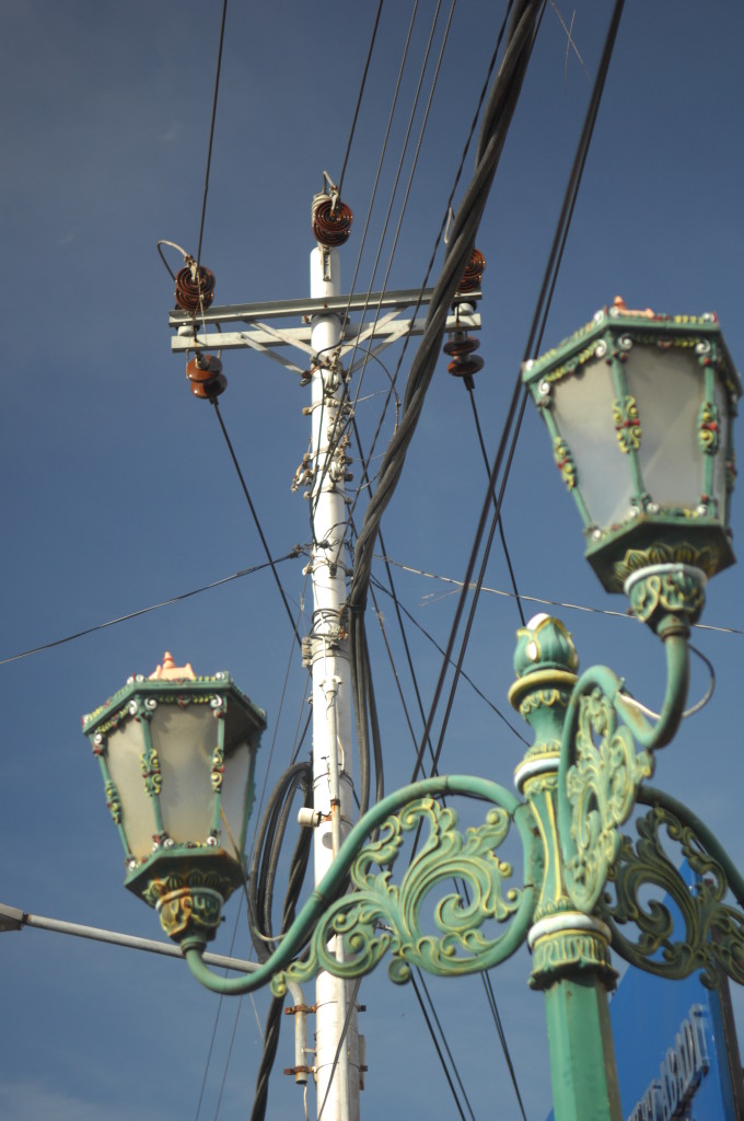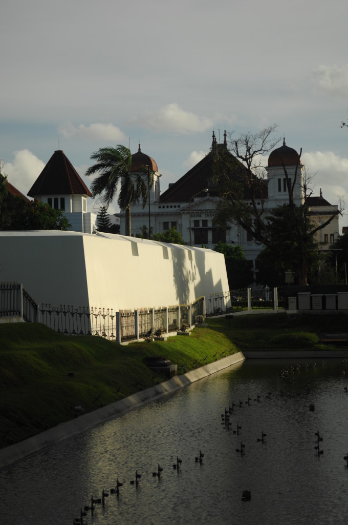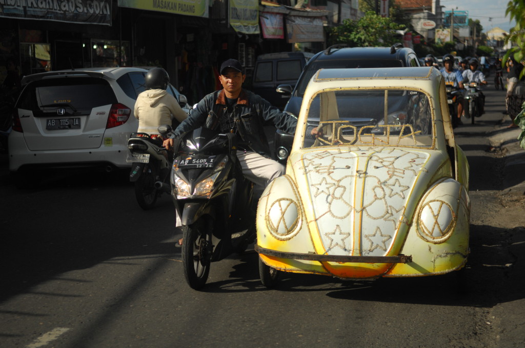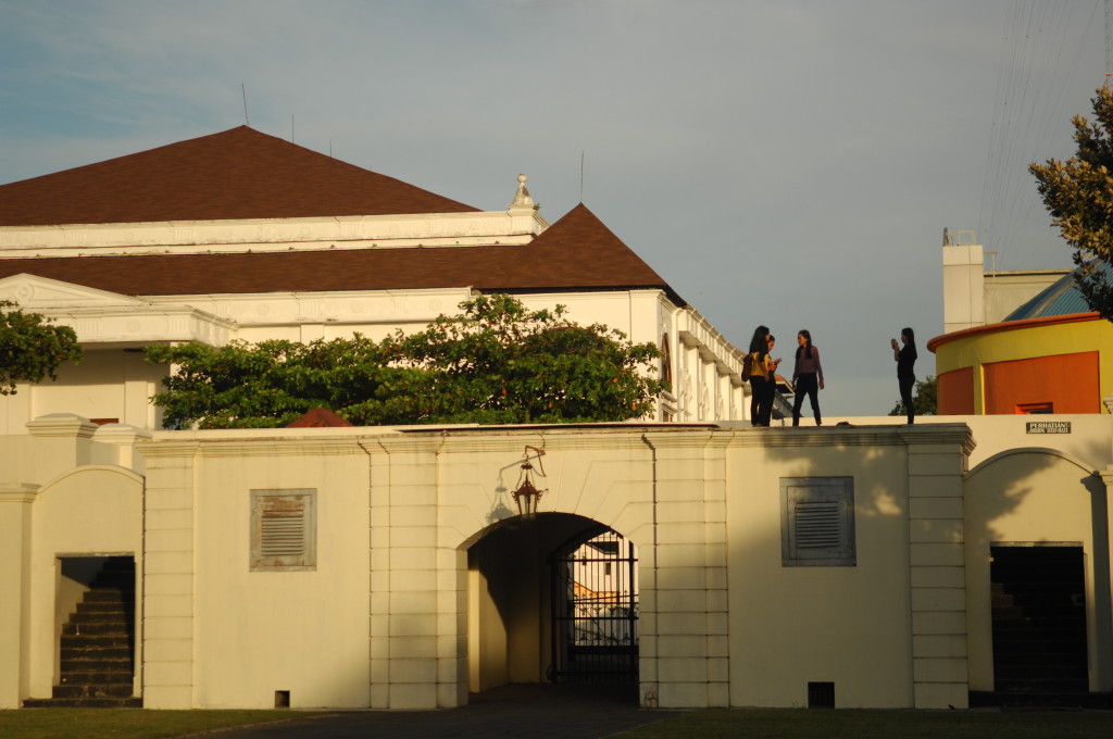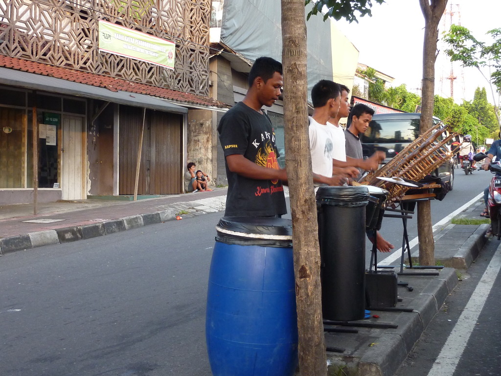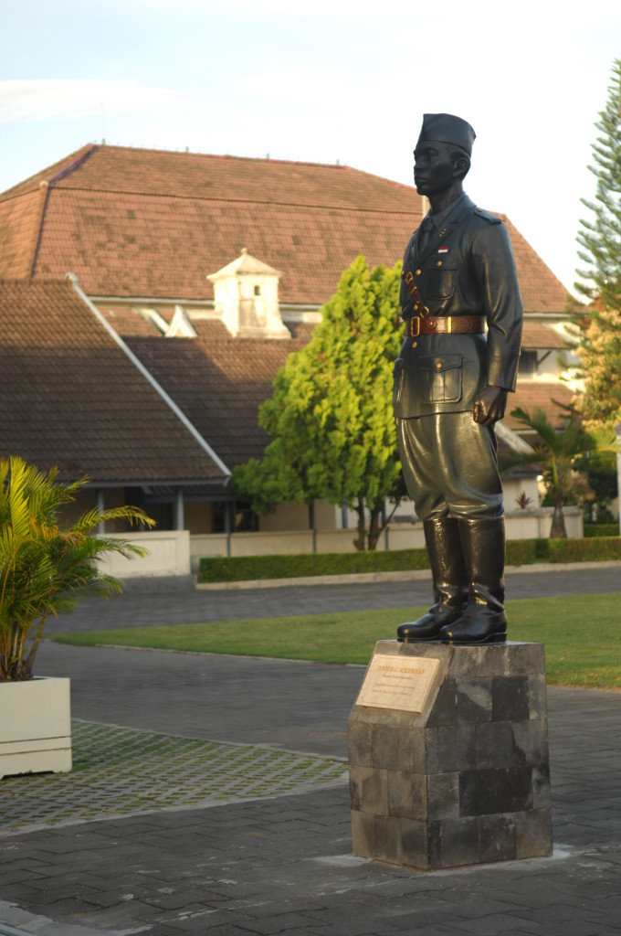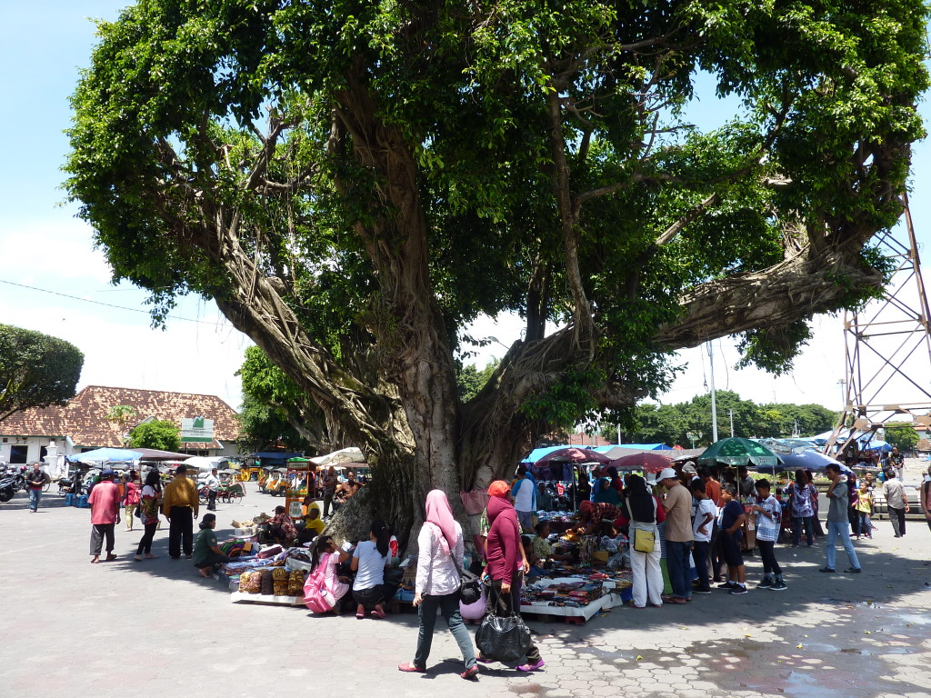 Unser Streifzug endet schließlich am Null Kilometer von Yogyarkata unweit der Vredeburg, einer Befestigungsanlage aus der holländischen Kolonialzeit. In den Baracken befinden sich rund 50 Dioramen, die die Geschichte vom Kampf um die Unabhängigkeit erzählen. Gegenüber der Festung befindet sich an der Jalan Malioboro der 0 Kilometer, eine ursprünglich für die Längenbestimmung aller Entfernungen Indonesiens genutzte Markierung. Es ist Samstagabend und bereits jetzt füllt sich der breite Gehweg mit Jugendlichen, die sich hier zum gemeinschaftlichen Abhängen, Sehen und Gesehenwerden treffen. Auch für Verpflegung ist gesorgt: auf kleinen Grills werden Saté und andere Snacks zubereitet.