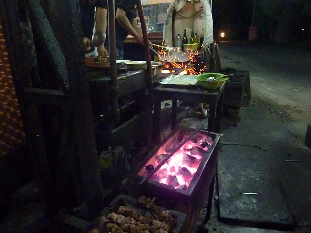 Gegen 20 Uhr holt uns Hanie mit ihrer Mutter erneut zum Essen ab. Es macht den beiden offensichtlichen Spaß, uns die kulinarischen Verstecke ihrer Stadt zu zeigen und unsere Geschmacksnerven zu testen. Heute soll es ein spezielles Lokal sein, in dem es nur Gerichte mit Ziegenfleisch gibt, Zicklein um genau zu sein. Es liegt etwa 10 km außerhalb der Stadt. Die parkenden Wagen vor dem Restaurant zeigen deutlich, dieser Geheimtipp ist bei den Einheimischen nicht unbekannt. Keine Sorge, dank unserer Begleitung wird schnell ein Tisch freigeräumt. Auf den Holzkohlengrills zur Straße hin brutzeln schon die Spieße, mehrere Angestellte sorgen laufend für Nachschub, schneiden das Fleisch in mundgerechte Stückchen und fädeln diese auf Fahrradspeichen anstelle von Holzspießchen.