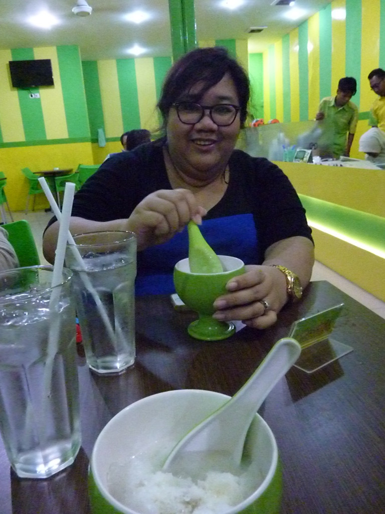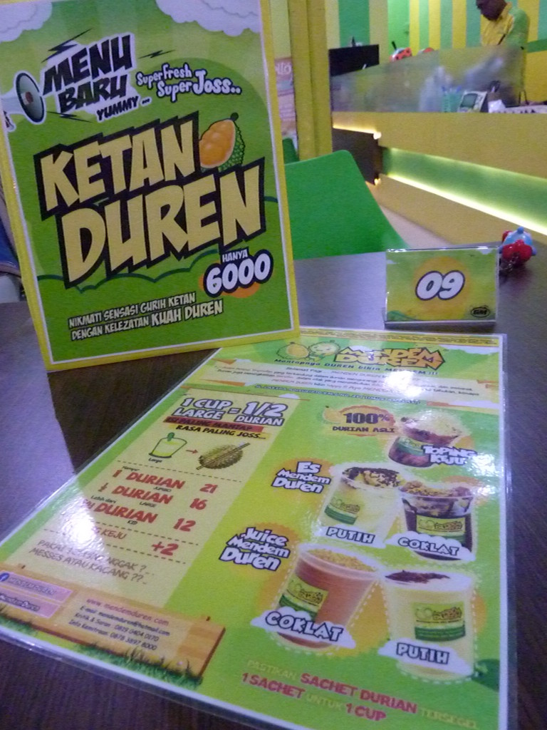 Die Location für den nächsten Hauptgang ist noch nicht geöffnet. BRAy Hj Jojokusumo schlägt deshalb vor, den Nachtisch vorzuziehen. Sie liebt Durian und ist begeistert, dass wir keine Einwände haben. Wieder kennt sie ein Lokal, das dafür das beste Angebot hat. Die Einrichtung ist schlicht in Durian-Grün und -Gelb gehalten. Ajengs Mutter bestellt für uns alle je eine kleine Portion Durian-Sorbet – Fruchtfleisch mit etwas Kondensmilch und gestoßenem Eis. Amüsiert beobachten die beiden, ob uns diese Zubereitungsart der Stink-bzw. Käsefrucht schmeckt. Ohne Übertreibung: Herrlich –oder wie man hier sagt: Lekker. Man darf sich einfach nicht vom Geruch täuschen lassen.