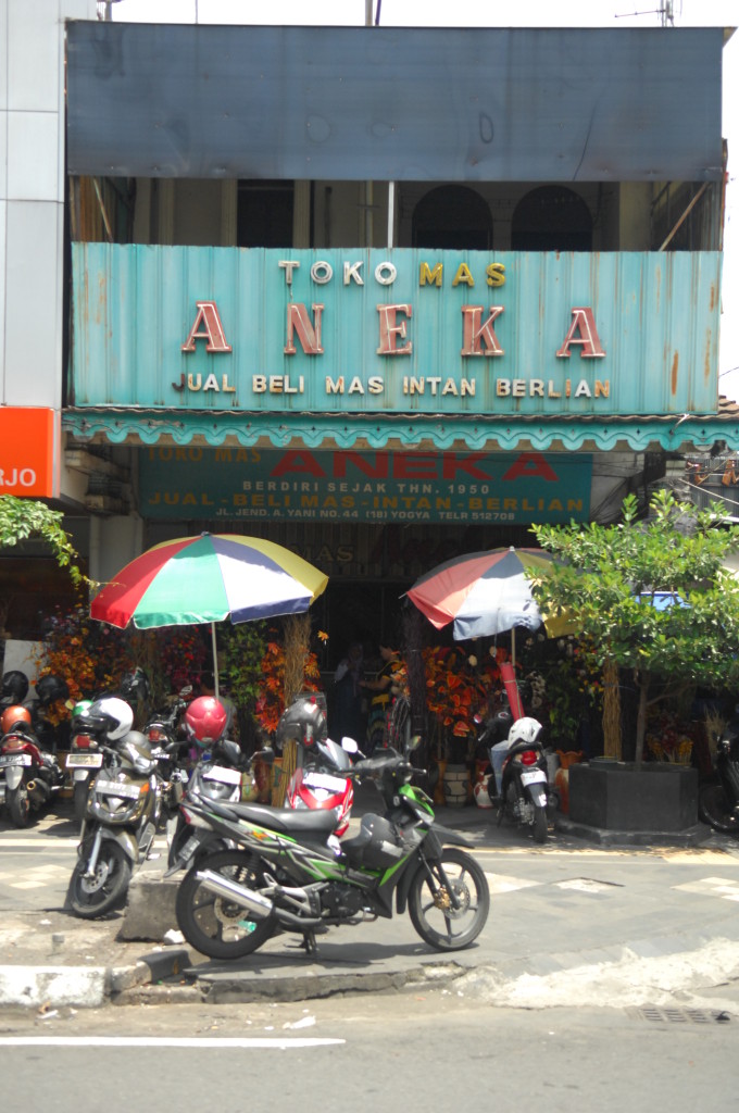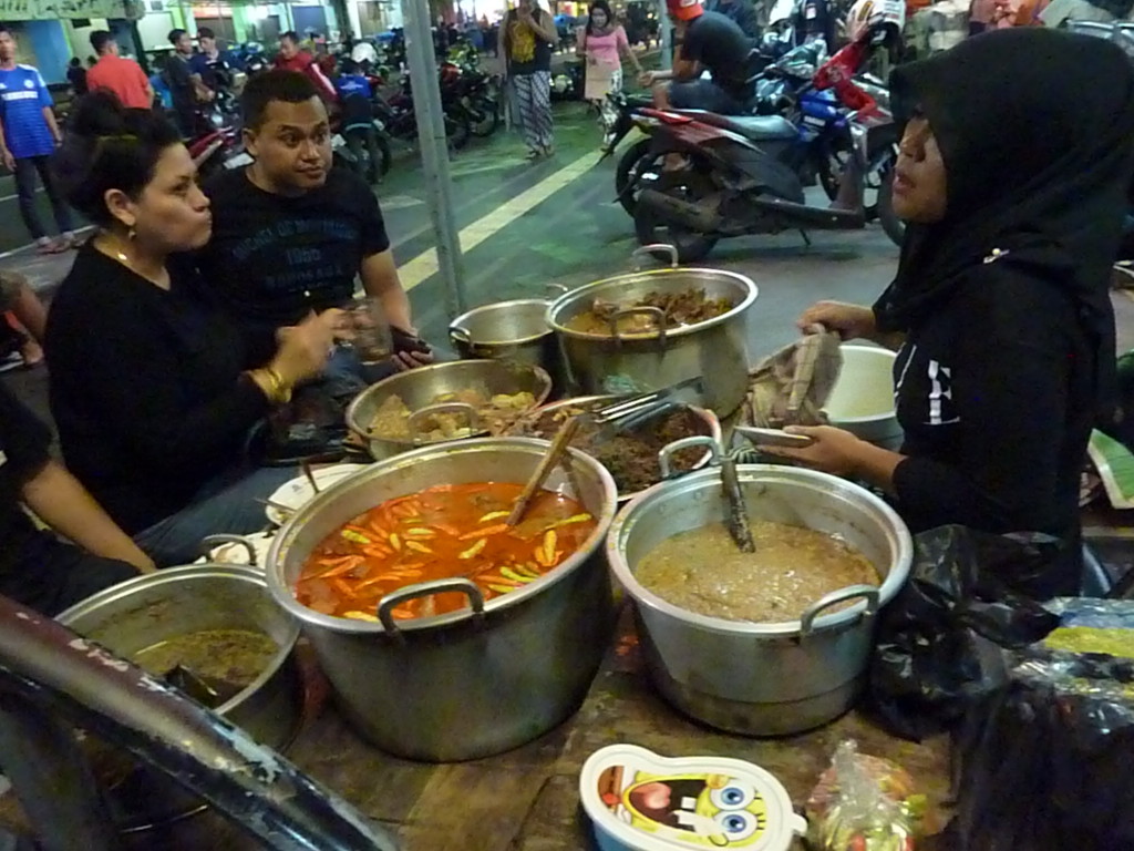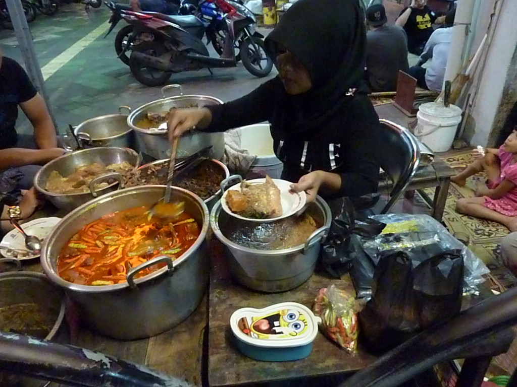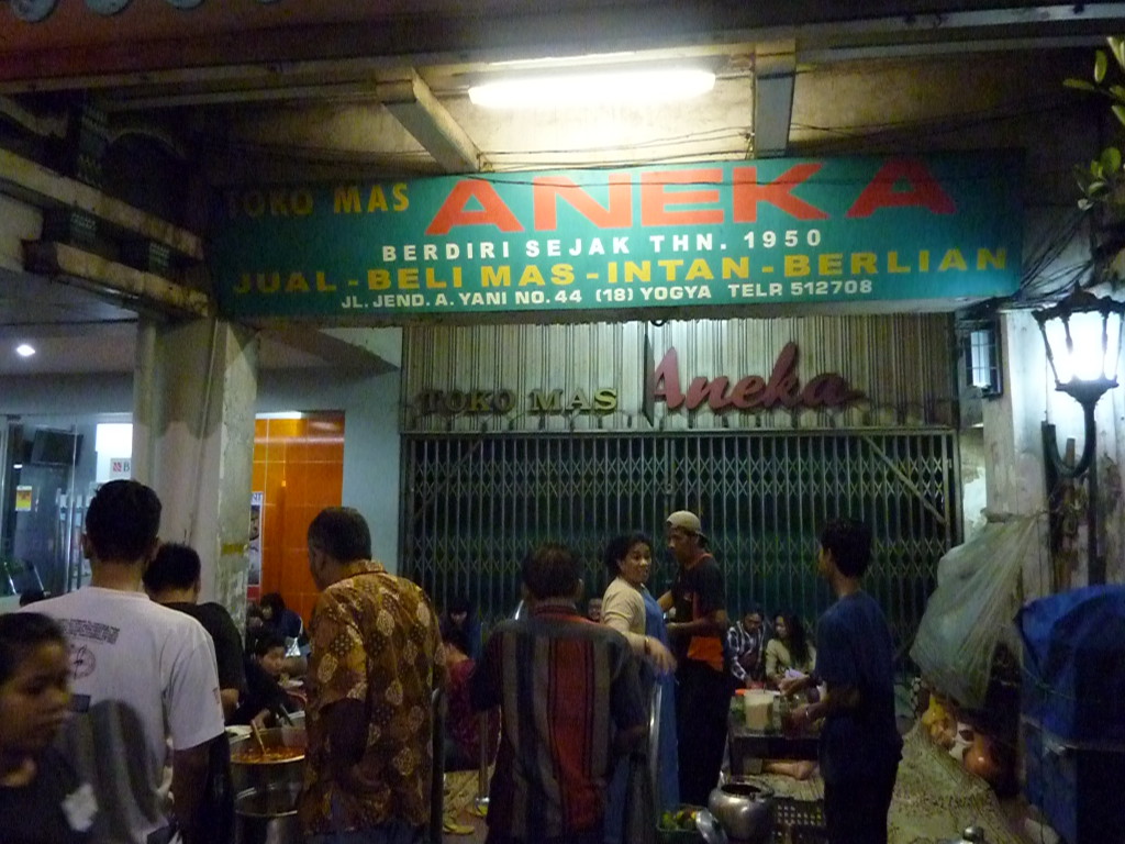 Weiter geht’s zum eigentlichen Highlight des Abends. Die Garküche mit dem besten Gudeg des Landes öffnet erst um 23 Uhr. Sie befindet sich im Eingangsbereich eines Ladens auf der Jalan Malioboro und wird dort jeden Abend neu aufgebaut. Als Sitzgelegenheit dienen Bambusmatten. Die Bestandteile der klassischen Gudeg stellt man sich aus den Töpfen der Garküchenchefin zusammen.