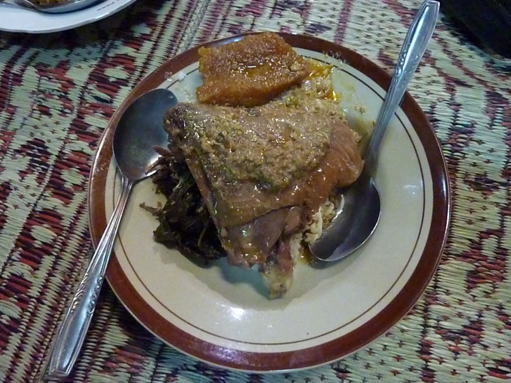 Die gesondert angebotene Würzpaste sollte man aber nur vorsichtig und in Maßen hinzufügen. Für den europäischen Gaumen wird es sonst schnell zu scharf. Zu Trinken gibt es den Saft kleiner grüner Orangen, der mit heißem Wasser aufgegossen wird und auf Wusch mit Eiswürfeln gleich wieder heruntergekühlt wird. Die Einheimischen lieben ihn gut gesüßt, wir mögen ihn lieber ungesüßt.